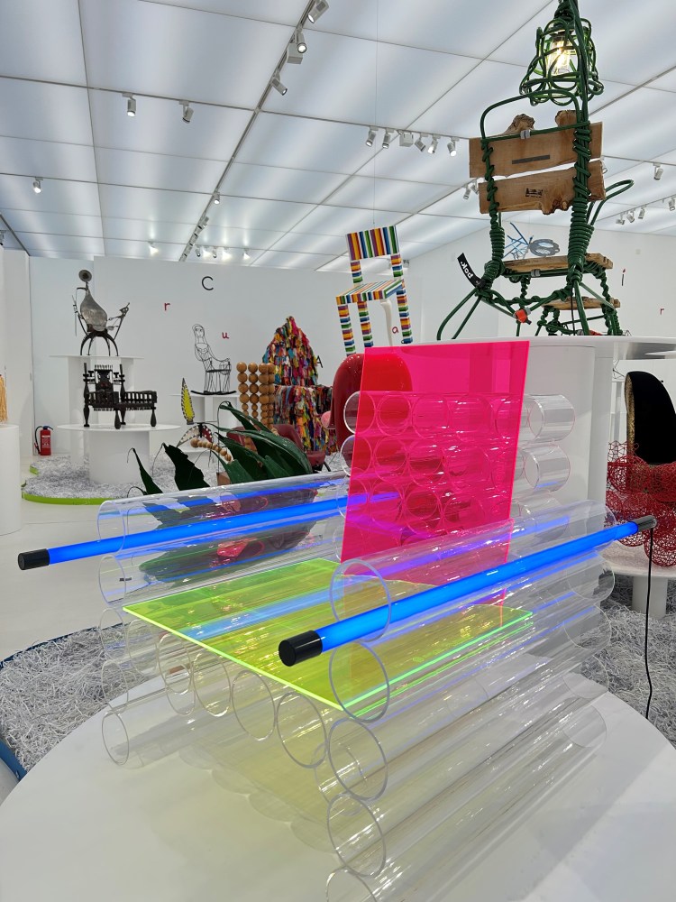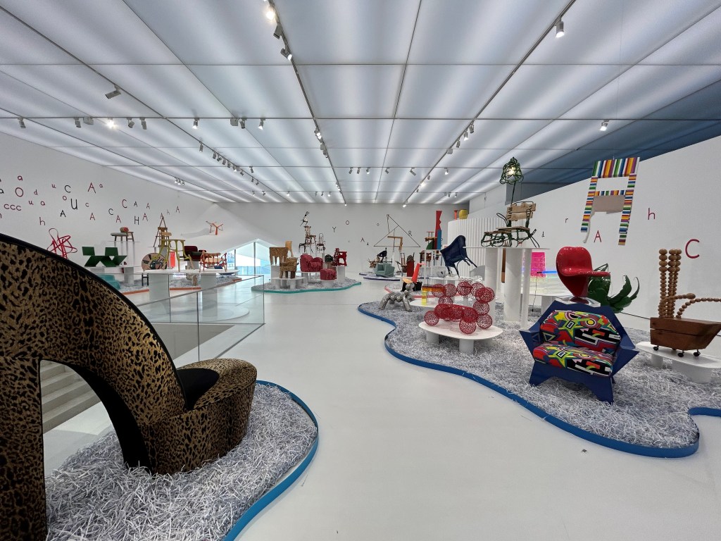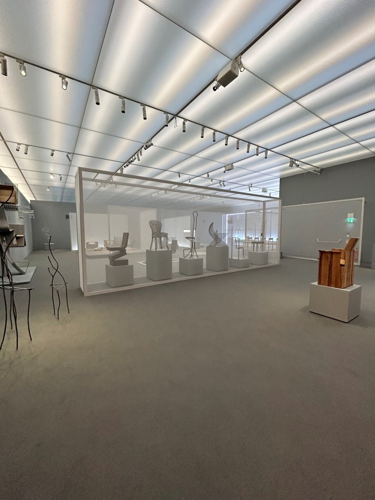 Comme le titre l’indique, il s’agit d’une exposition de diverses chaises provenant d’une des plus grandes collections privées au monde de chaises d’artistes, de designers et d’architectes dont le propriétaire était Thierry Barbier-Mueller (décédé le 24 janvier 2023). Cette collection est du moins originale et surprenante car elle regorge de propositions d’assises inédites. Evidemment, la plupart de ces chaises n’ont pas de but utilitaire car elles ne sont tout simplement pas utilisables mais ont néanmoins une vocation esthétique.