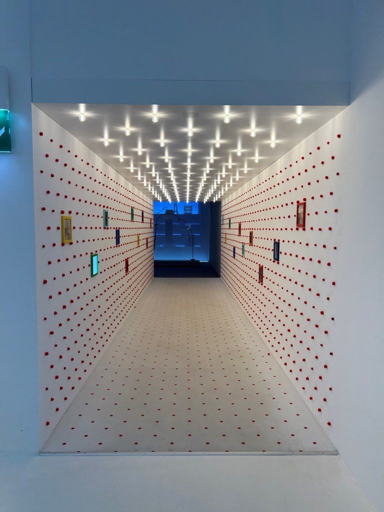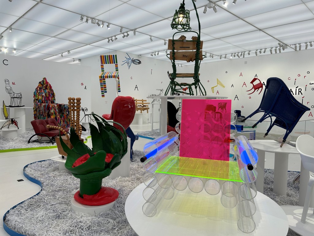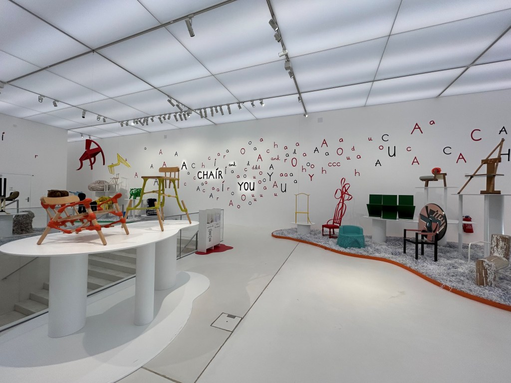Le parcours se fait en quatre actes ou en quatre univers. On commence d’abord dans une grande salle très éclairée dont le décor est entièrement blanc du sol au plafond. Ce premier espace présente des chaises colorées, le blanc permet ainsi de mettre en valeur et faire ressortir les chaises de leur espace. Une multitude de lettres provenant du titre de l’exposition sont éparpillées un peu partout sur les murs.