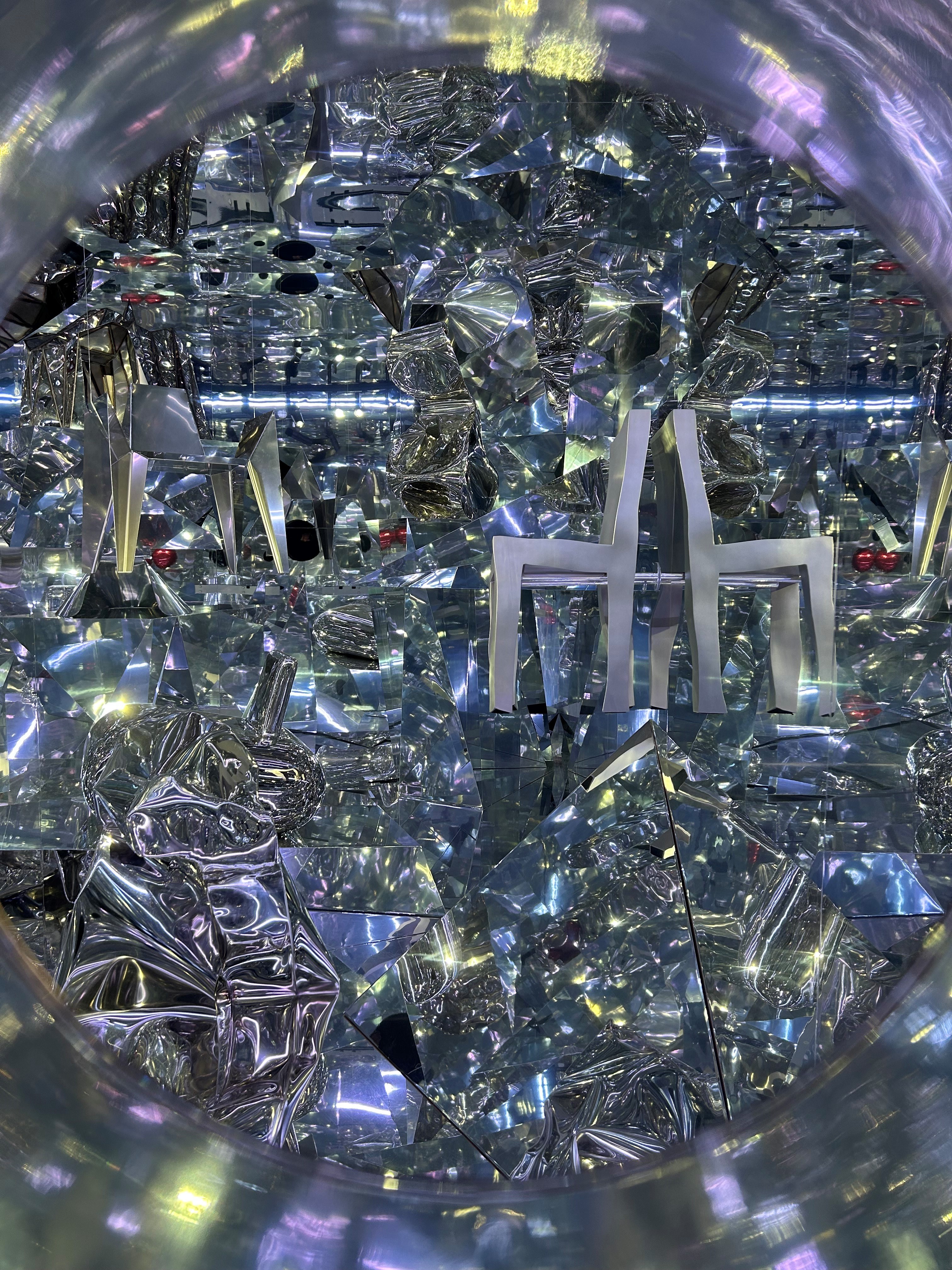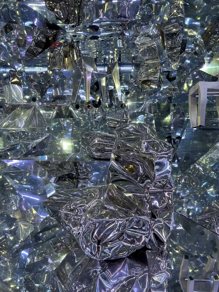 Nous terminons la visite dans un sorte de sas où un mur avec plusieurs trous de différentes tailles laisse voir le clou du spectacle, une installation aux reflets kaléidoscopiques. Bien que le son soit, pour ma part, agressif et désagréable, cette installation avec ces reflets infinis est juste magnifique. Effet wow garanti !