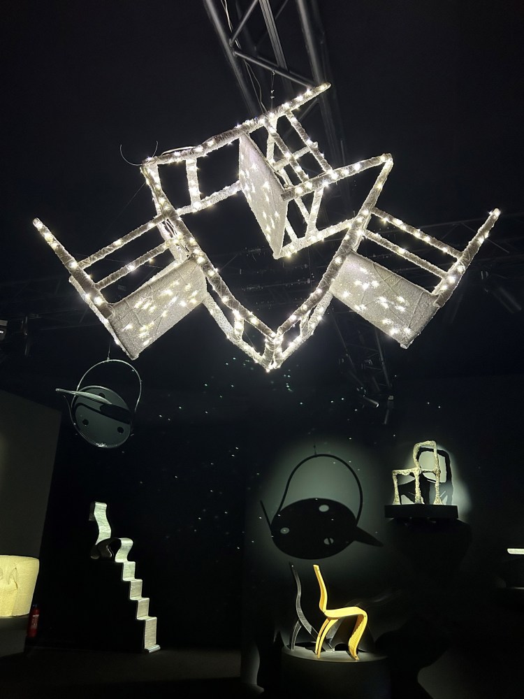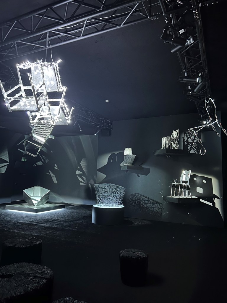 Mon impression pour cette exposition est très positive, je l’ai beaucoup aimé notamment grâce à la scénographie. On plonge vraiment à travers différentes ambiances, différents univers par le biais du décor, de la lumière ou encore des différents sons. La transition entre chaque salle se fait par un passage pour aller d’un « monde » à un autre avec un tunnel ou une petite ouverture au mur par-laquelle il faut se baisser pour entrer dans une salle obscure rendant ainsi le parcours ludique. Tous les aspects changent progressivement : on commence dans une salle très clair puis grise puis noire. On passe d’un éclairage intense à une lumière un peu plus tamisée pour finir dans l’obscurité. Au niveau du son, une musique amusante nous accompagne au début puis, une musique entraînante pour finir avec une musique douce. La scénographie a su rendre l’exposition de ces chaises captivante.