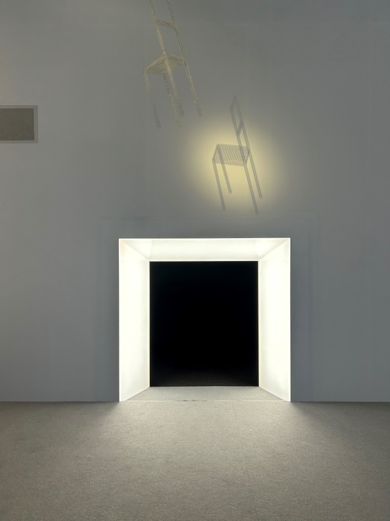 Le prochain passage est une petite ouverture très mystérieuse dans le mur. On se demande même si on peut y entrer tant l’obscurité à l’intérieur y est profonde. C’est en se baissant qu’on s’engouffre dans la troisième est dernière salle plongée dans le noir. Seul des spots directionnels illuminent les chaises exposées. La musique, ici, y est plus douce et calme.