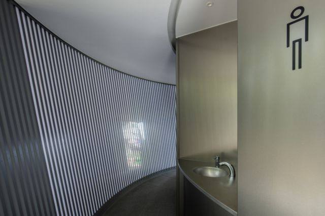 La face avant des toilettes est blanche tandis qu’une baie vitrée avec un panneau lumineux géant se trouve à l’arrière. Les lumières du panneau passent du vert durant la journée au blanc durant la nuit. Ces lumières dansent et flottent comme des petites lucioles en pleine nuit.