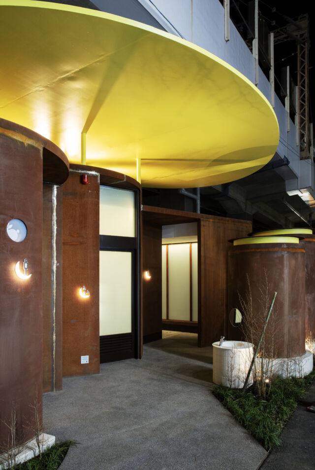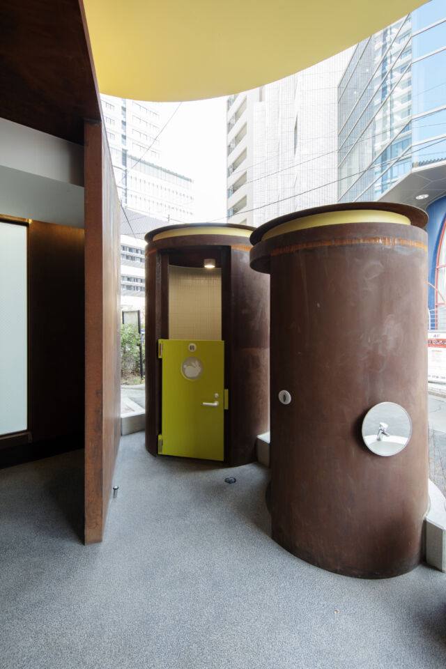 Un grand auvent jaune en forme d’ovale plane au-dessus d’une série de toilettes cylindriques de différentes hauteurs, avec des silhouettes de lapins qui se dévoilent depuis les fenêtres rondes installées sur les murs extérieurs. Les circonstances spécifiques au site ont nécessité une construction légère, il a donc été décidé d’utiliser une structure en panneaux de plaques d’acier résistant aux intempéries pour la conception de l’installation. Un grand auvent est également suspendu au-dessus, créant une ouverture semblable à un ciel pour éliminer la sensation sombre et fermée de la zone située sous les voies surélevées de la ligne Keio. Les panneaux de plaques d’acier résistant aux intempéries ont été rouillés une fois pour conserver leur force et leur texture indéfiniment. Kobayashi souhaite créer des toilettes publiques ayant une forte présence, tel un vieil homme têtu veillant constamment sur les gens, tout en instaurant une atmosphère amusante et divertissante en même temps. L’ouverture de l’installation est large, lui conférant une sensation massive mais ouverte, avec un intérieur lumineux et propre qui est également sécurisé.
