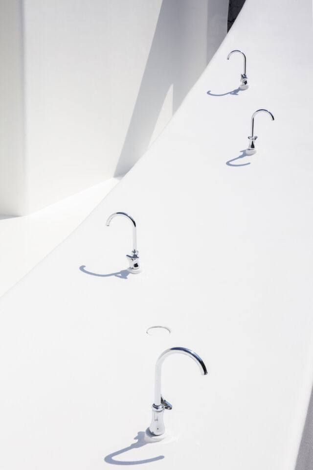 D’après Fujimoto, une toilette publique est comme une fontaine en plein cœur de la ville. Un équipement de lavage des mains public est accessible non seulement à ceux qui utilisent les toilettes, mais aussi à un large éventail de personnes ayant des besoins différents. Les toilettes agissent comme un grand récipient unique conçu pour l’usage de tous. La forme de l’installation, avec son grand centre concave, résulte de l’intégration de stations de lavage des mains de différentes hauteurs. Elle vise à créer une petite communauté de personnes, des enfants aux personnes âgées, rassemblées autour du récipient pour se laver les mains, boire de l’eau et engager la conversation. L’idée est de proposer un nouveau type d’espace public où les gens peuvent se réunir et communiquer autour de l’eau.