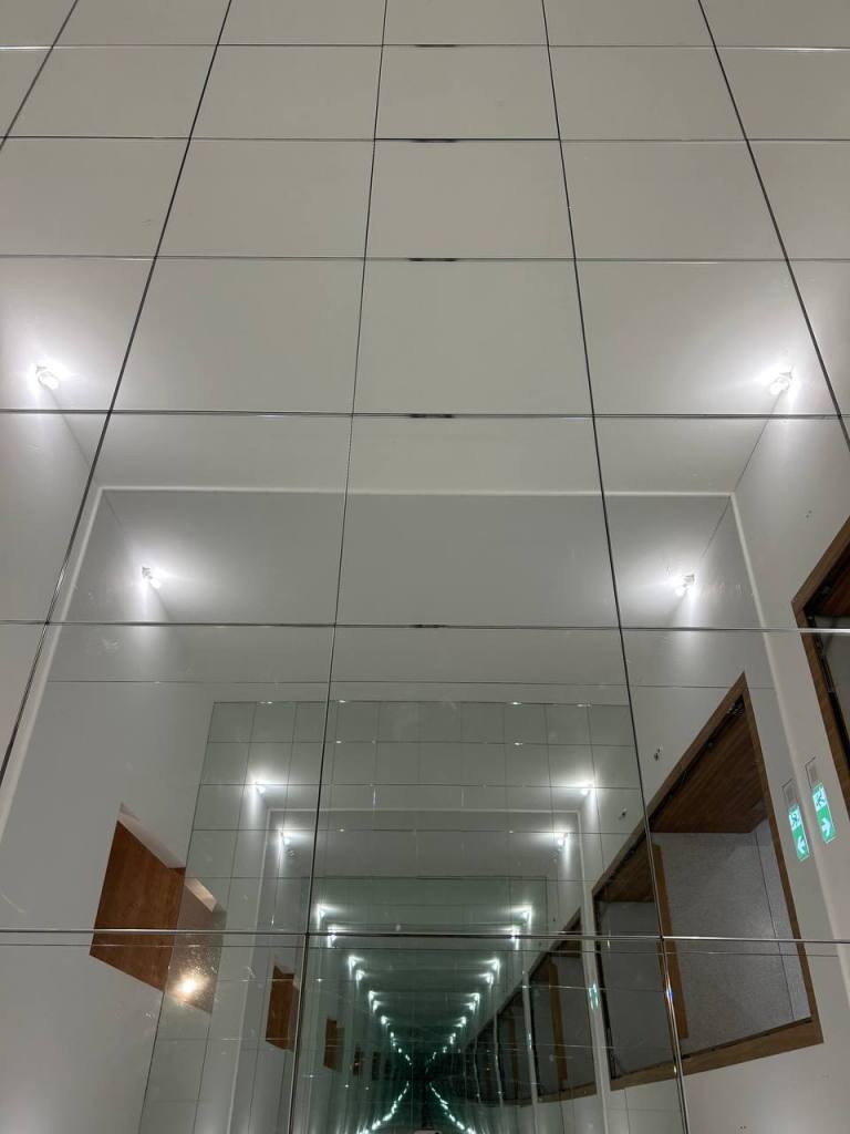 Nous débutons l’exposition par un passage tapissé d’éclats de miroir sur le sol ainsi qu’au plafond reflétant l’espace de manière fragmentaire. La disposition, en face-à-face, des miroirs donnent une dimension immersive et expansive de telle sorte que l’espace se prolonge virtuellement. Ainsi, nous sommes confrontés à une expérience perceptive intense de dédoublement vertigineux, à l’infini grâce à la réflexivité des miroirs.