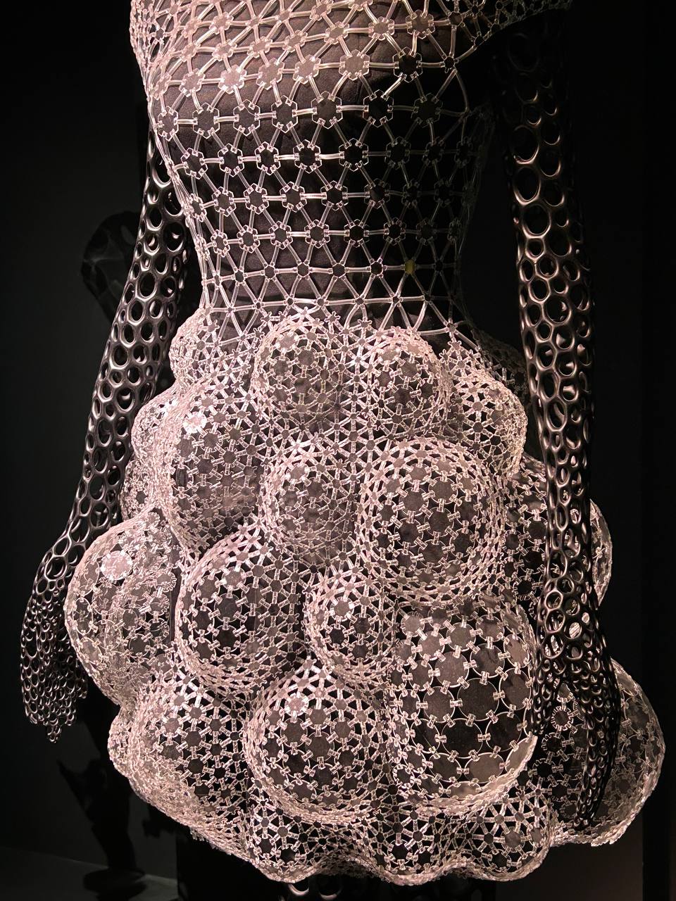 Ainsi, l’exposition nous donne un bel aperçu du large éventail de techniques et de matériaux qu’utilise Iris van Herpen, allant du moulage en silicone, de l’impression 3D et de la découpe au jet d’eau au plissé ancien et à la sculpture aimantée. En créant des matériaux innovants et en utilisant des textures révolutionnaires, Iris van Herpen élabore, tel un architecte, des microarchitectures, mais avec une distinction notable : ce sont des microarchitectures en mouvement. Dès que le corps entre en action dans l’espace, ses robes prennent vie, dans un spectacle où se mêlent textures, matières, frottements, glissements, couleurs et transparences. D’ailleurs, certaines robes présentées sont véritablement mobiles ce qui est très inhabituel pour un vêtement.