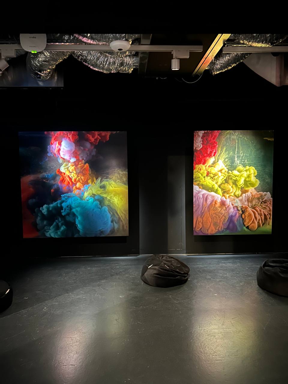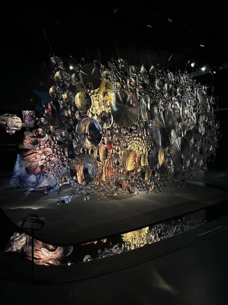 Le parcours s’achève sur une présentation des œuvres d’Iris van Herpen comme projetées dans l’immensité du cosmos. Ses robes y sont présentées dans une danse du ciel, des corps flottant dans l’espace comme en apesanteur, se soustrayant de toutes lois gravitationnelles. Les œuvres photographiques de l’artiste Kim Keever, mais aussi des prises de vue de nébuleuses appellent également à s’élever pour ressentir le monde de manière plus holistique. Une superbe œuvre d’Haruka Kojin, faite de lentilles en acrylique de différentes tailles, joue avec la transparence. Cet installation n’est pas sans rappeler des bulles d’eau qui flottent dans l’air.