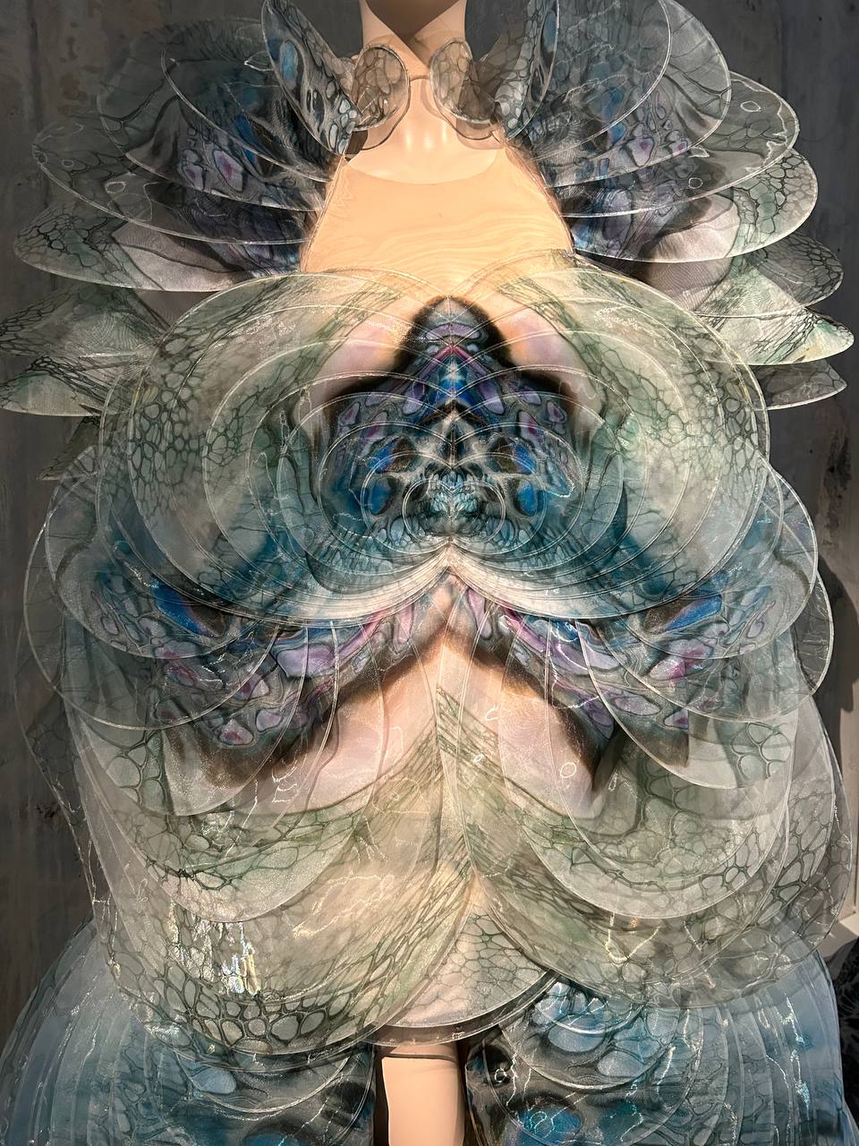 Réalisée à partir de peinture abstraites évoquant les fonds marins par des nuances de turquoise et de violet, la robe Hydrozoa est formée d’une succession de feuilles en plastique PetG découpées au laser puis thermocollées à de nombreuses couches d’organza de verre imprimé numériquement. Une fois en mouvement, l’architecture de la robe se déploie dans l’espace et rappelle la structure des coraux ondulant au gré de l’eau.