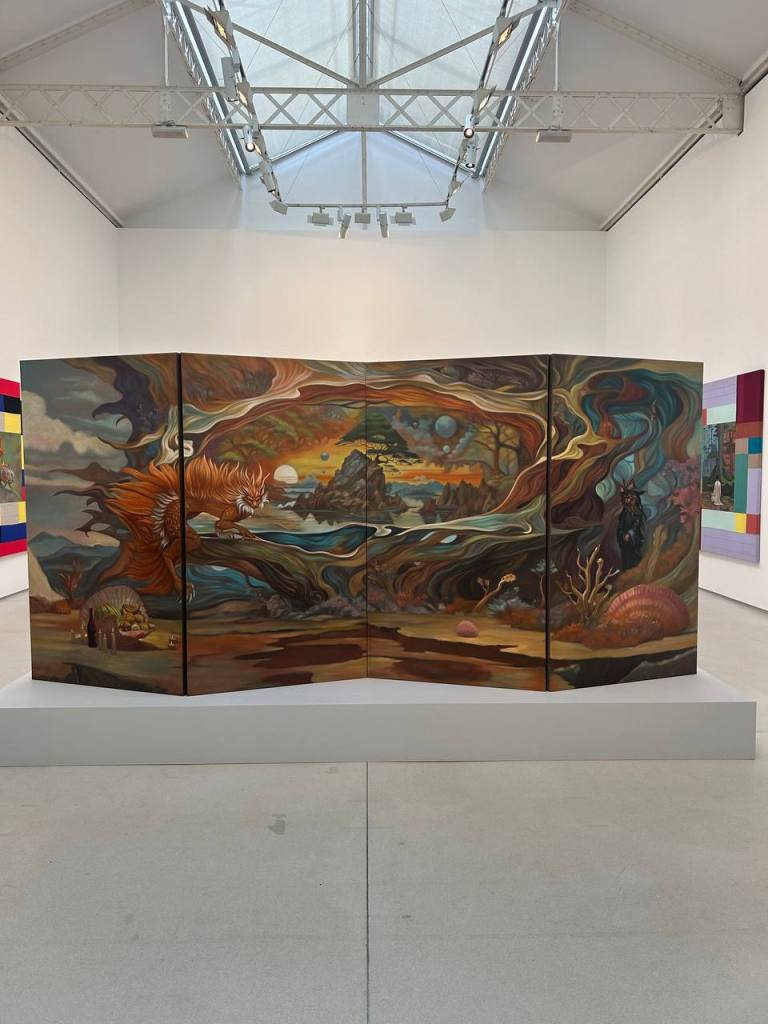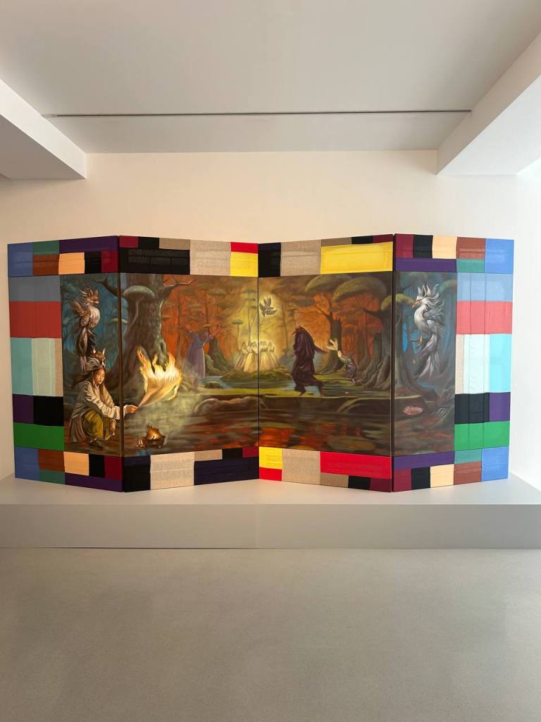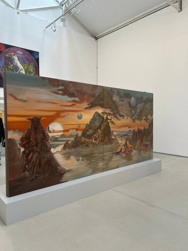Chaque peinture est liée aux autres par des résonances visuelles inattendues ou des répétitions, tandis que plusieurs des personnages voyagent entre les peintures et même à travers les médiums, se glissant et disparaissant au fil des déplacements du visiteur dans l’exposition pour donner une impression de temps non linéaire et de multiples univers parallèles mais connectés.