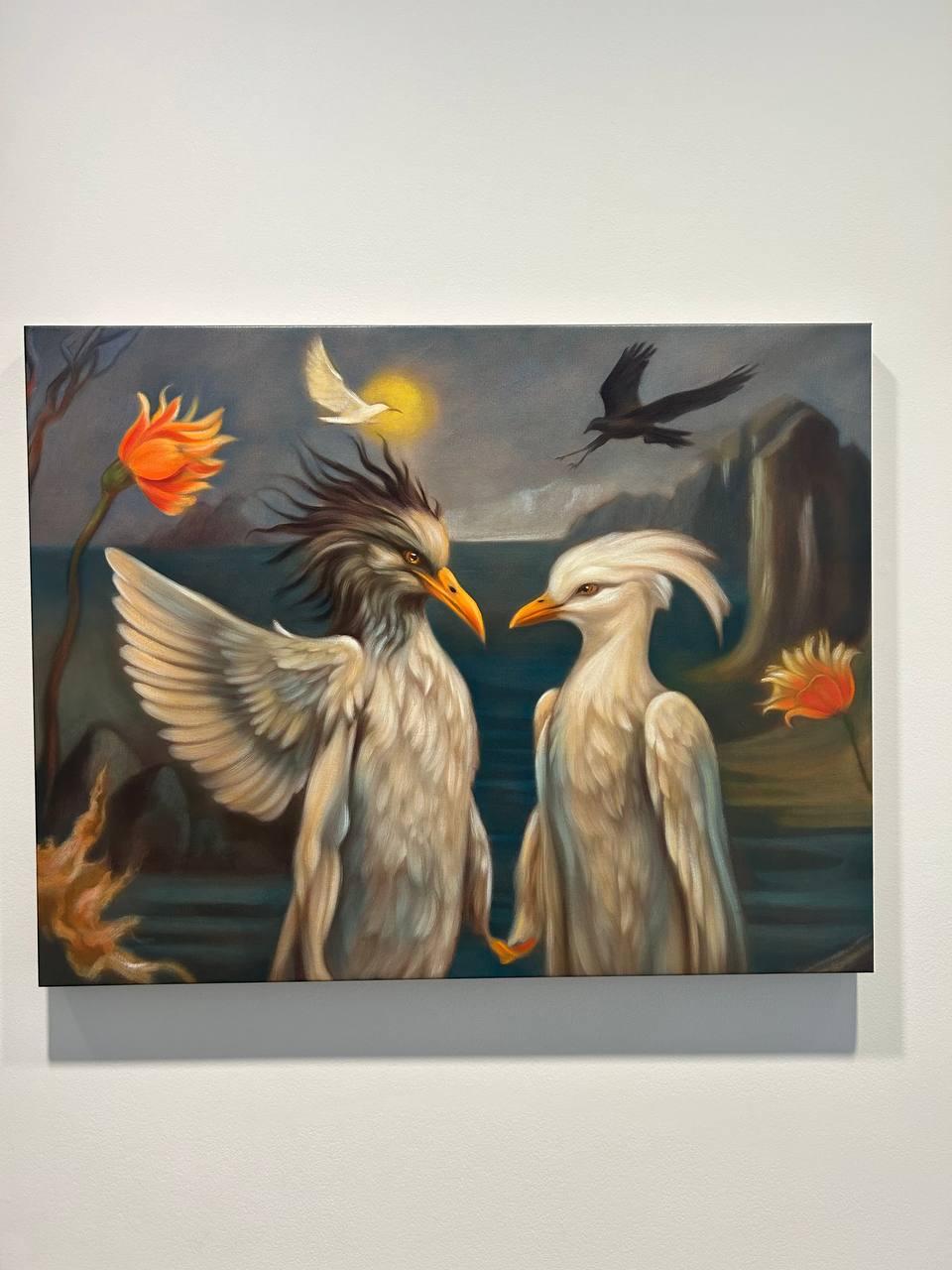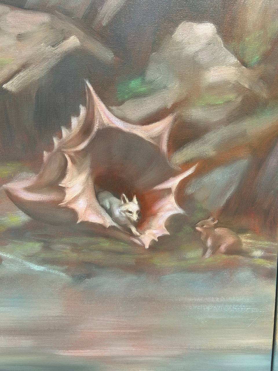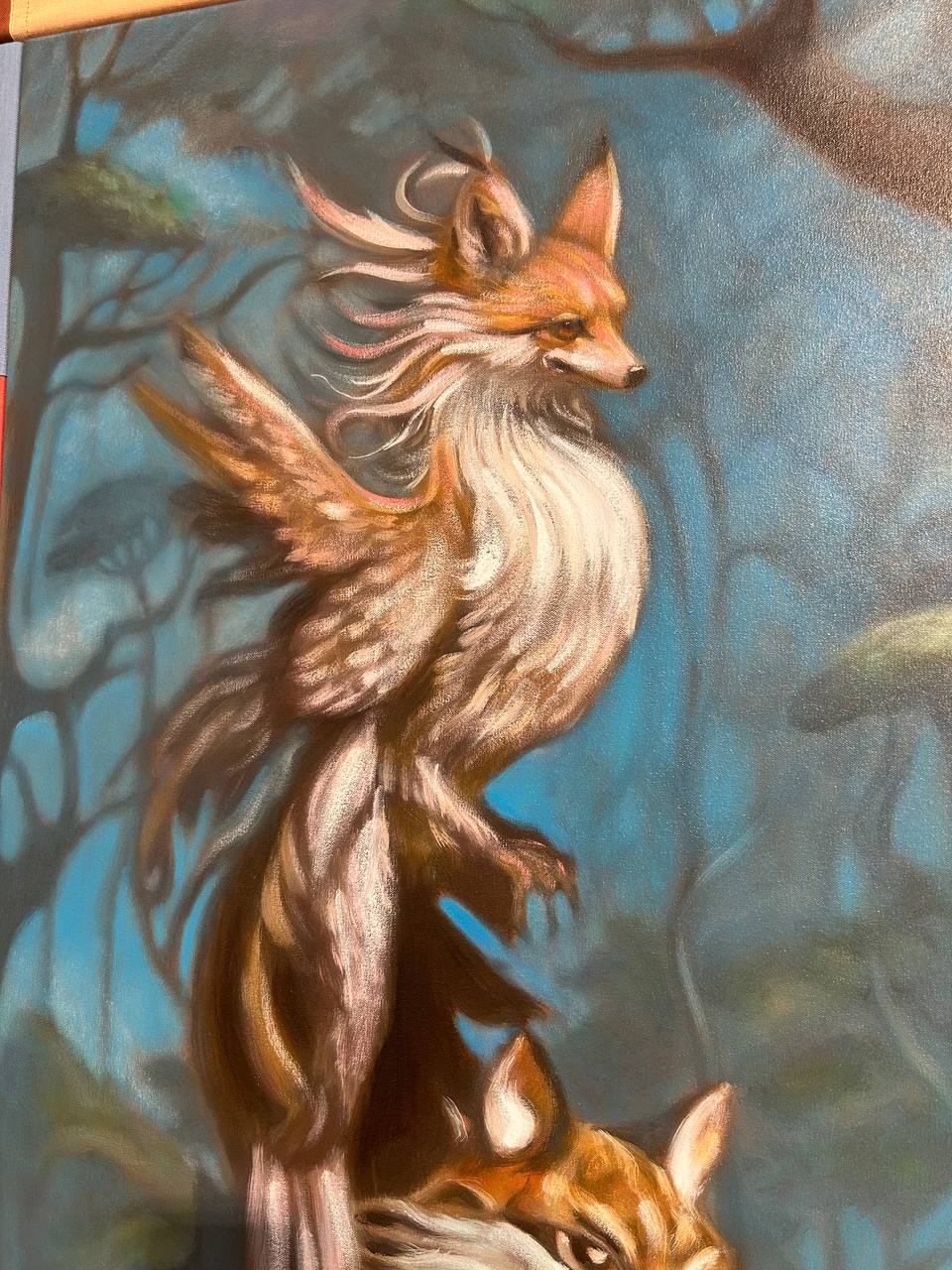 De la nature, des animaux, des mondes oniriques, il n’est pas surprenant que les œuvres de cette exposition m’aient conquise. Ce sont des thèmes que j’affectionne particulièrement. J’aime l’effet parfois vaporeux et brumeux des paysages et des animaux dont le pelage ou le plumage flotte gracieusement dans l’air. Ces peintures sont teintées de mystère de par leurs atmosphères et leurs personnages encapuchonnées quelque peu énigmatiques.