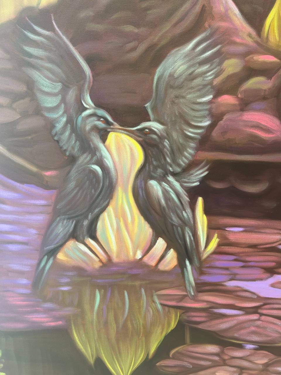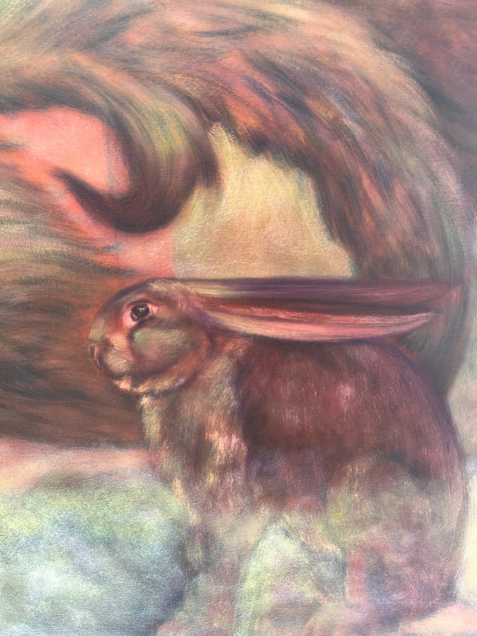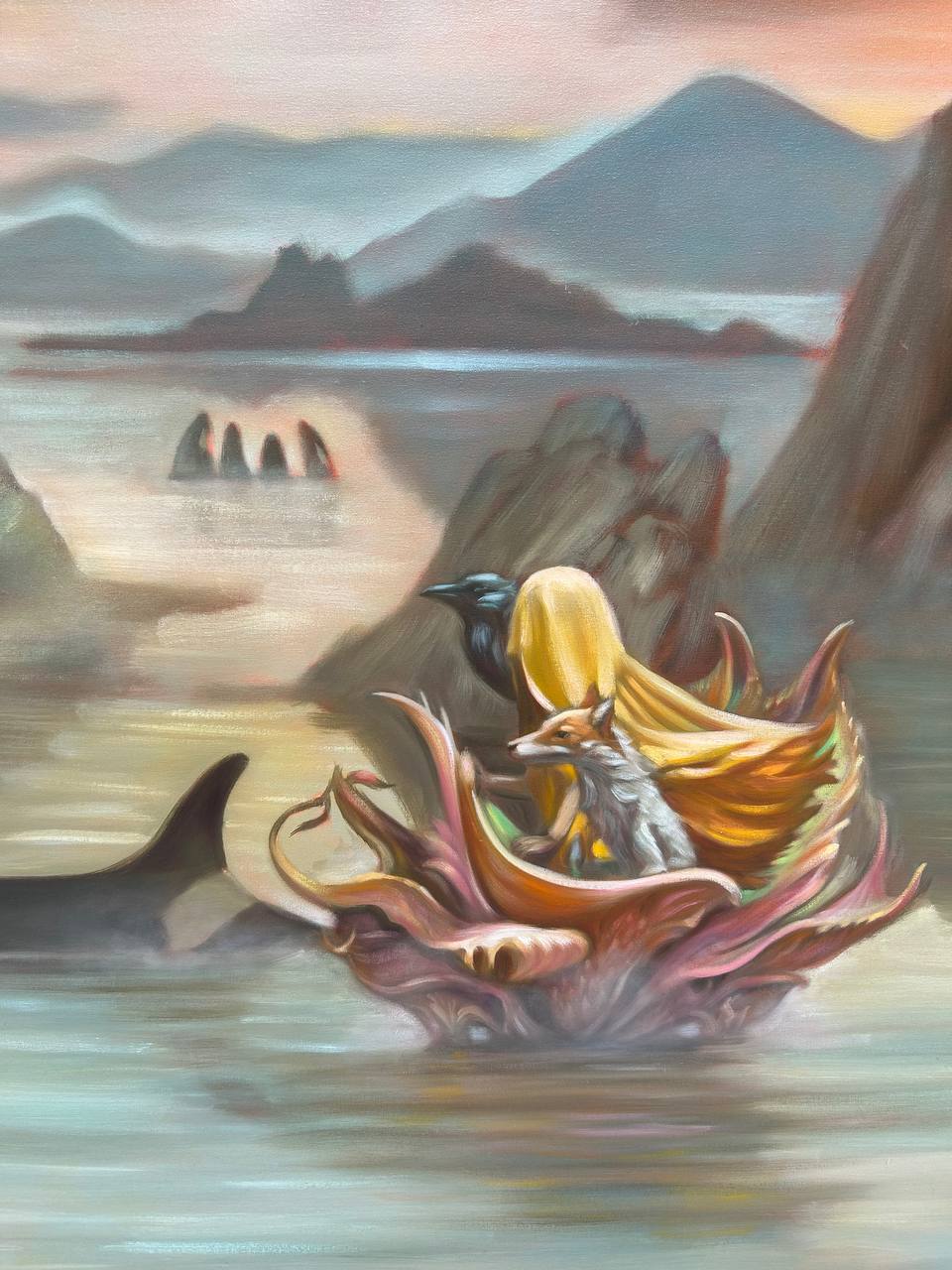 De la nature, des animaux, des mondes oniriques, il n’est pas surprenant que les œuvres de cette exposition m’aient conquise. Ce sont des thèmes que j’affectionne particulièrement. J’aime l’effet parfois vaporeux et brumeux des paysages et des animaux dont le pelage ou le plumage flotte gracieusement dans l’air. Ces peintures sont teintées de mystère de par leurs atmosphères et leurs personnages encapuchonnées quelque peu énigmatiques.