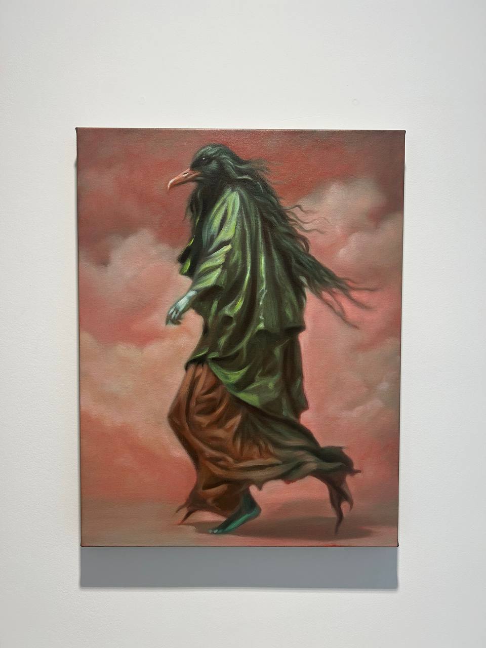 Les renards, corbeaux et mouettes qui tissent et se déplacent dans l’exposition sont tirés de la réalité urbaine de l’artiste, tandis que d’autres personnages – des figures encapuchonnées avec des têtes d’oiseaux ou des queues plumeuses – sont des hybrides imaginés. Pour Xa, les animaux portent un pouvoir allégorique abondant, tout comme dans le folklore et la mythologie coréennes, qui offrent également à l’artiste un riche réservoir de créatures et de personnages pour peupler ses peintures.