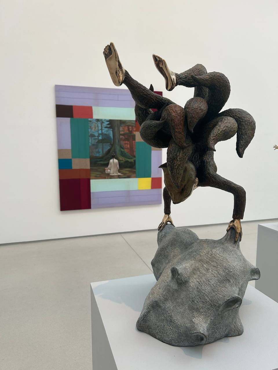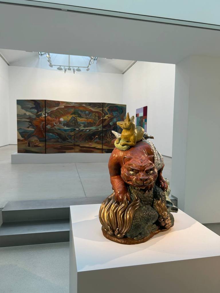 À l’entrée de l’exposition se trouve une sculpture composée de créatures entrelacées, toutes tournées dans différentes directions de sorte que, quel que soit l’angle sous lequel elle est observée, elle regarde toujours le spectateur. L’une des créatures représentées est un haetae : un animal mythologique coréen souvent placé à l’entrée des bâtiments civiques pour protéger, juger et refuser l’entrée aux méchants. Plutôt pratique, non ?