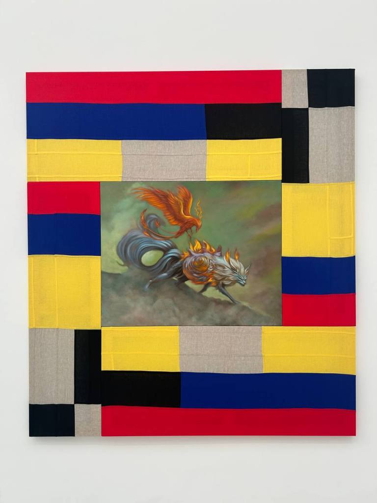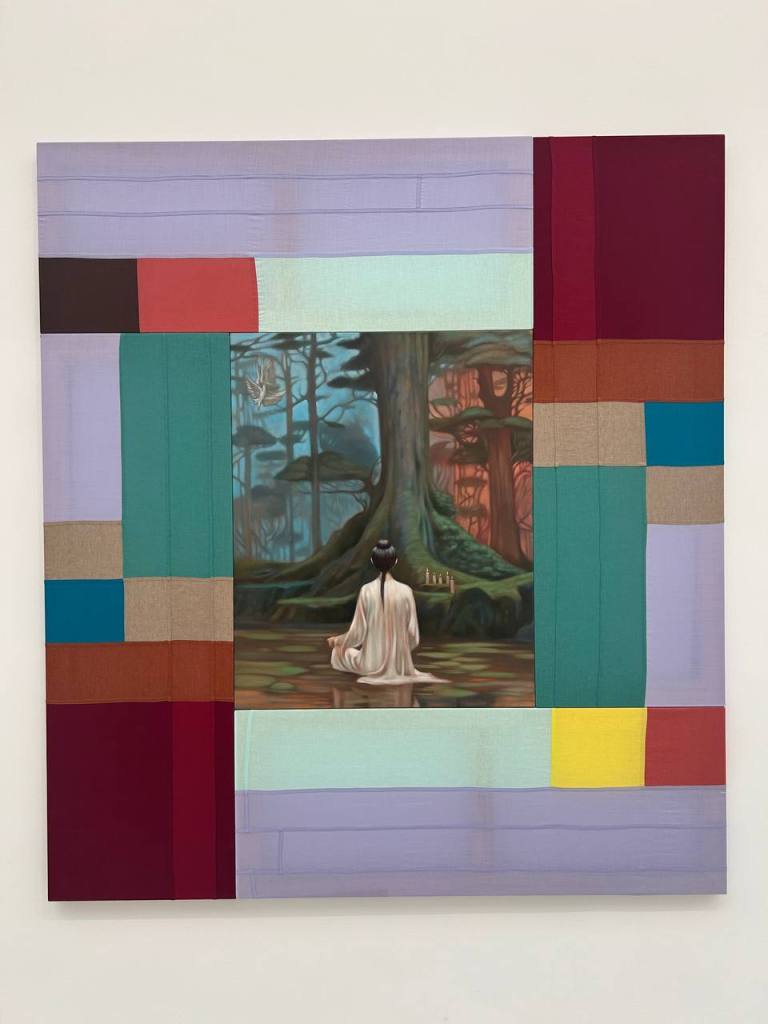 Le textile est également une partie intégrante de l’exposition « Rough hands weave a knife », émergeant à la fois à travers les cadres en patchwork multicolores qui entourent certaines des peintures et à travers des œuvres autonomes faites de morceaux irréguliers de lin et de denim. En eux, Xa puise dans le langage visuel de l’abstraction géométrique moderniste européenne et américaine ainsi que dans la tradition du patchwork bojagi coréen. En réunissant ces sources de référence, Xa comble le fossé entre les pratiques considérées comme « art » et celles considérées comme « artisanat », défiant la relation hiérarchique établie entre elles.