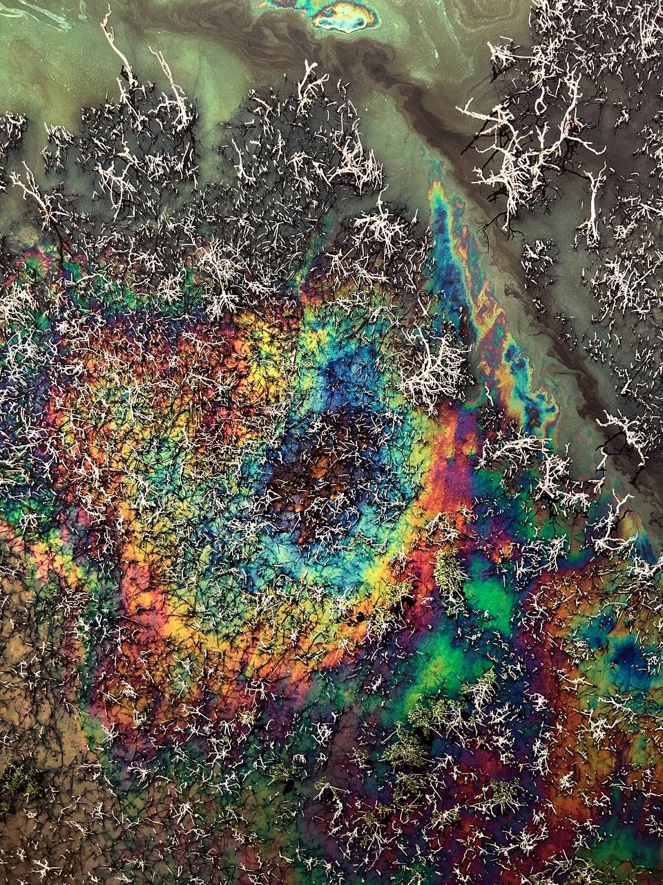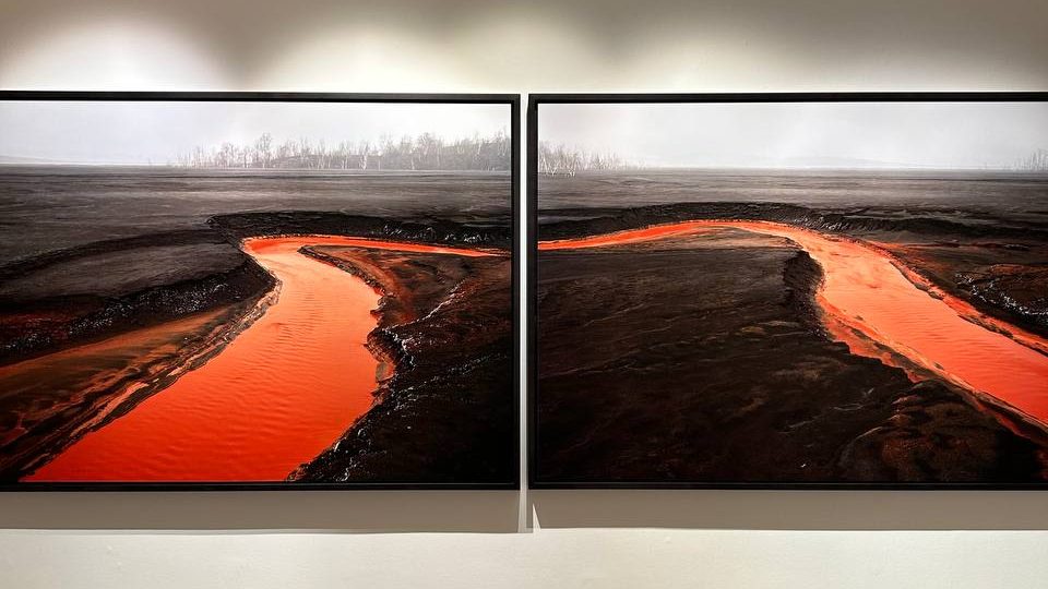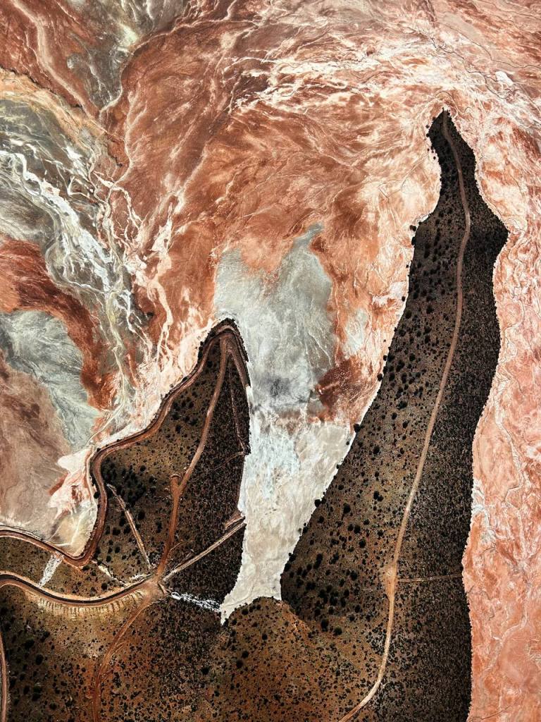 Cette photographie révèle les conséquences environnementales de l’extraction et de la fusion des métaux. Sous un ciel gris et frais, sur un arrière-plan hivernal sombre d’arbres lointains, une rivière orange brillante serpente vers la caméra, au milieu d’un paysage brun profond. Les couleurs saisissantes sont celles que nous voyons lorsque la lave s’écoule d’un volcan en éruption, ce qui explique peut-être pourquoi nous associons immédiatement cette image à une catastrophe naturelle. En réalité, les rouges et oranges intenses sont causés par l’oxydation du fer qui reste dans le processus de séparation du nickel et d’autres métaux du minerai.