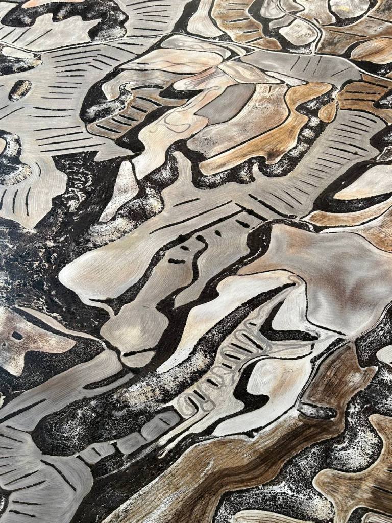 Dans son travail, on peut y voir un paradoxe. D’un côté, plutôt négatif, les ravages de l’activité humaine infligés à Mère-Nature et de l’autre côté, plus positif, une certaine beauté visuelle rendue par ces activités. Lignes courbes ou droites, crevasses, cercles, trous, flaques, champs grillagés, monticules sont autant de formes différentes qui se dessinent sur la surface de la planète en des œuvres abstraites hybrides, mi-naturelles, mi-artificielles. Ainsi, sont mis en avant les marques indélébiles laissées par l’humanité sur la face géologique de la planète. Certaines images laissent également apparaître des traces calligraphiques des véhicules faisant référence à cette activité humaine.
