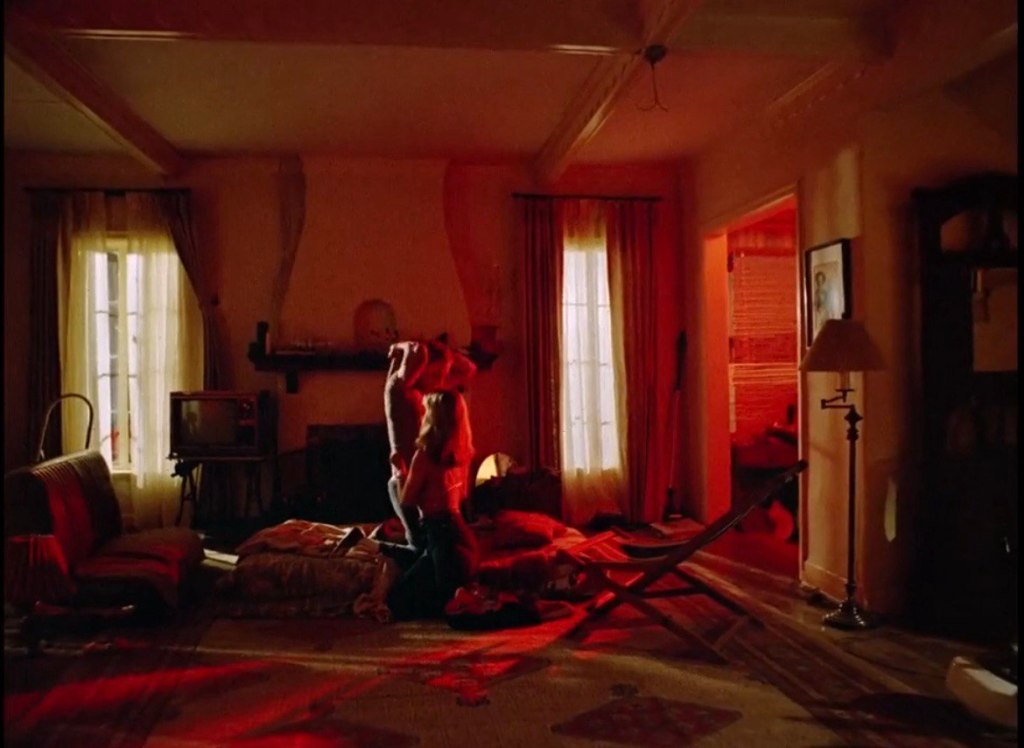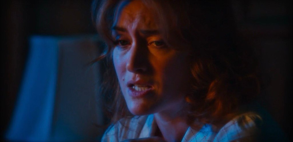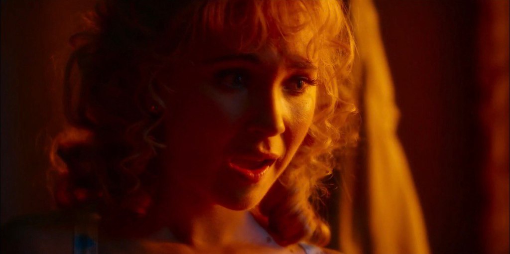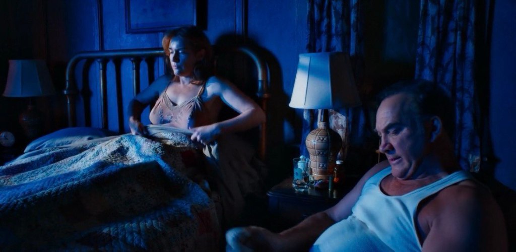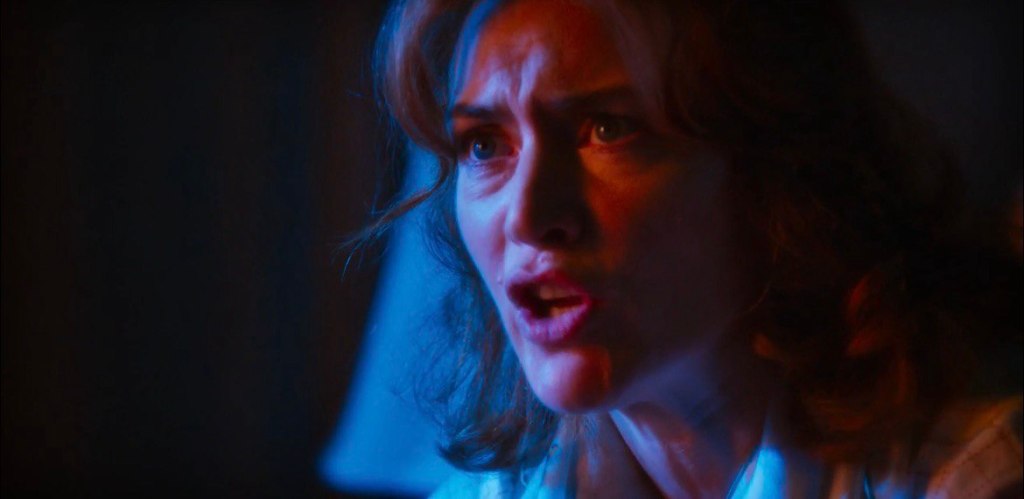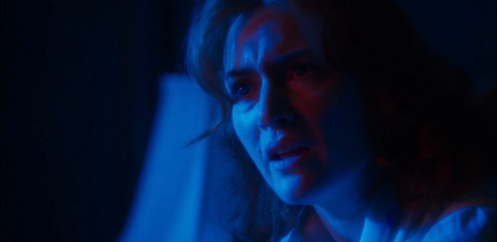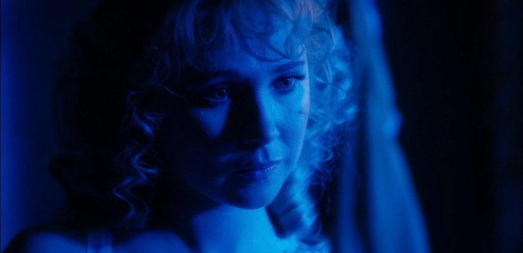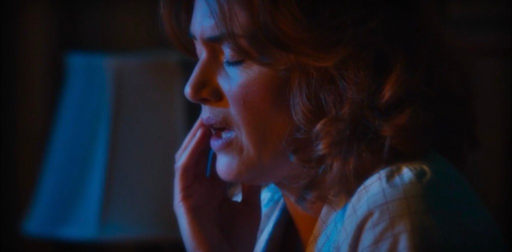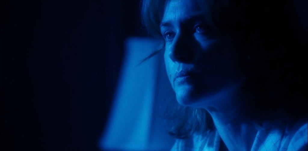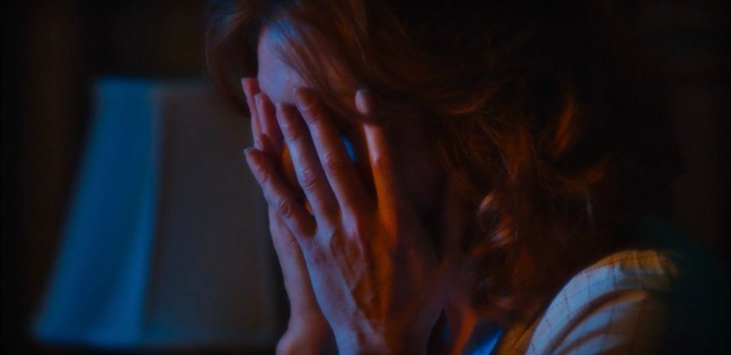 Durant cette scène, les visages de Carolina et de Ginny sont filmés en gros plan pour encore mieux souligner leurs expressions faciales et les différentes émotions qui les traversent. La submersion émotionnelle intense qu’éprouve Ginny, à ce moment-là, est rendue visuellement par l’inondation lumineuse de la pièce. Si dans un premier temps, la chambre se trouve baignée de lumière bleue suggérant la tristesse de Ginny, dès l’arrivée de son mari dans la pièce, une lumière orangée apparaît en même temps. Cette mise en scène laisse suggérer que son mari est le fruit de sa colère refoulée, due à la frustration et l’insatisfaction de son mariage couplée par l’information qu’elle vient d’apprendre de la part de Carolina. La tristesse laisse donc place à la colère.