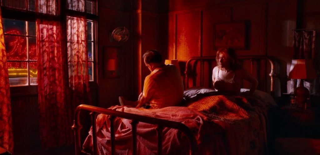 Coppola utilise les néons pour raconter une grande partie de l’histoire à travers des images plutôt que des dialogues. Les lumières servent de métaphore visuelle pour les hauts et les bas de la relation entre Hank et Frannie. Par exemple, lorsqu’ils se séparent ou se réconcilient, les changements de lumière et de couleur peuvent signaler des transitions émotionnelles importantes, presque comme un code visuel pour le spectateur.