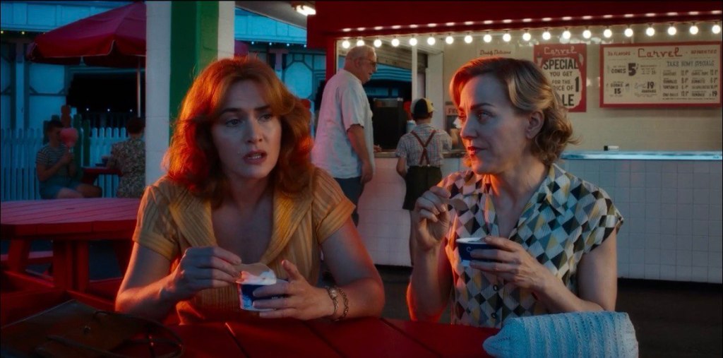 Le film se déroule dans les années 1950 à Coney Island, un lieu célèbre pour ses manèges et ses lumières au néon. Les néons sont omniprésents, créant une atmosphère à la fois nostalgique et oppressante. Ils rappellent le glamour et l’évasion offerts par les parcs d’attractions, contrastant avec la réalité des personnages, qui sont souvent piégés dans des situations désespérées.