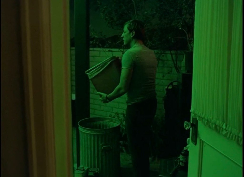 Les bleus et les verts : ces couleurs plus froides sont utilisées pour souligner les moments de réflexion, de solitude ou de désillusion. Elles peuvent représenter les moments où les personnages se sentent perdus ou déconnectés l’un de l’autre. De plus, la couleur verte au cinéma signifie souvent la monotonie, on peut donc suggérer que la lumière verte présente dans et autour de la maison souligne la routine quotidienne qui les a amené à se déconnecter l’un de l’autre.