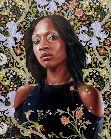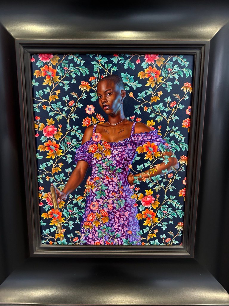 Puissance visuelle : Ses œuvres sont marquées par une utilisation vibrante des couleurs et des motifs floraux ou ornementaux qui remplissent le fond de ses toiles. Ces motifs décoratifs, souvent inspirés de tissus africains ou de références baroques, sont une signature visuelle de Wiley. Ils apportent une touche de luxe et de grandeur, tout en contrastant avec la simplicité et le naturel des postures de ses modèles.