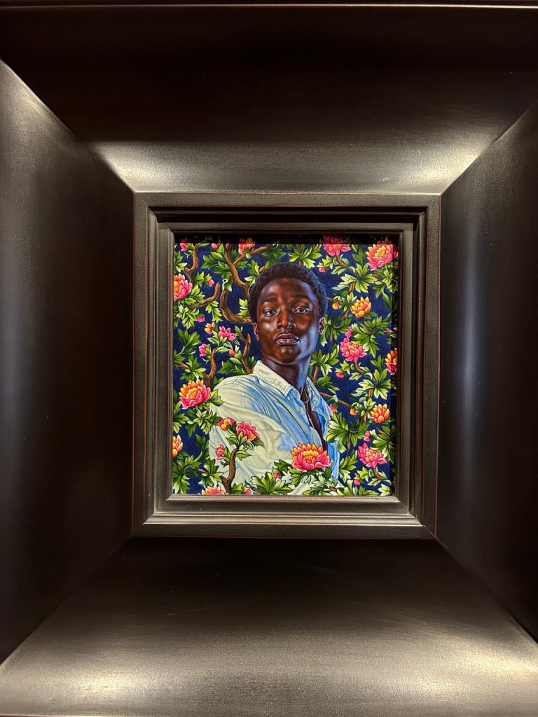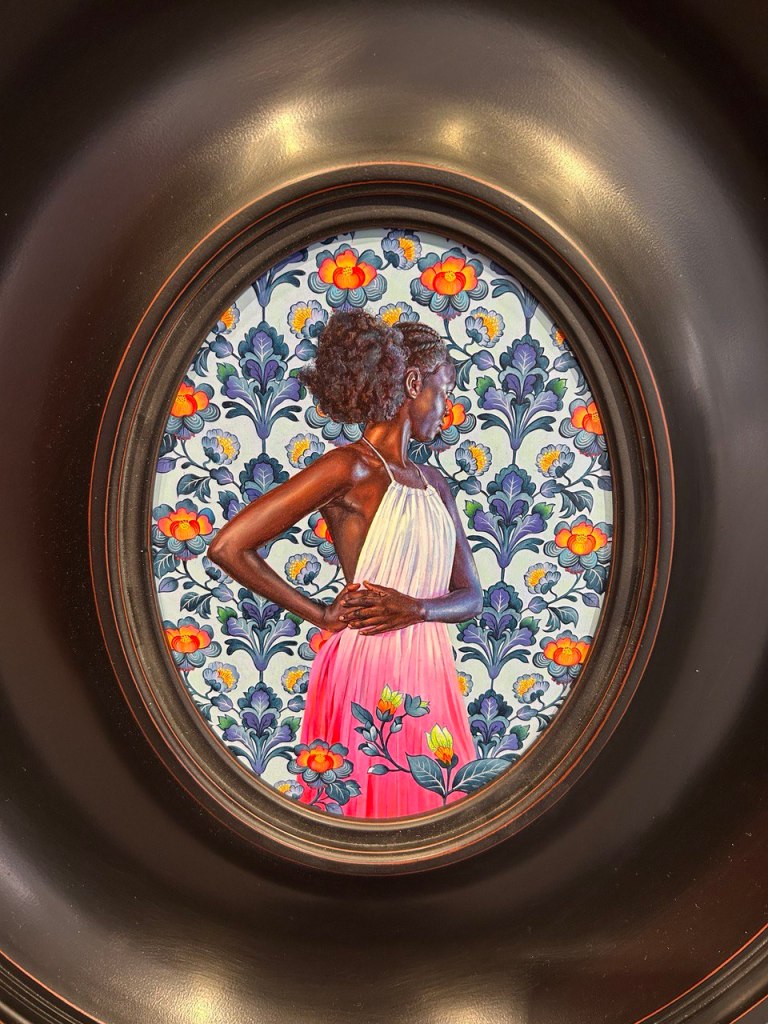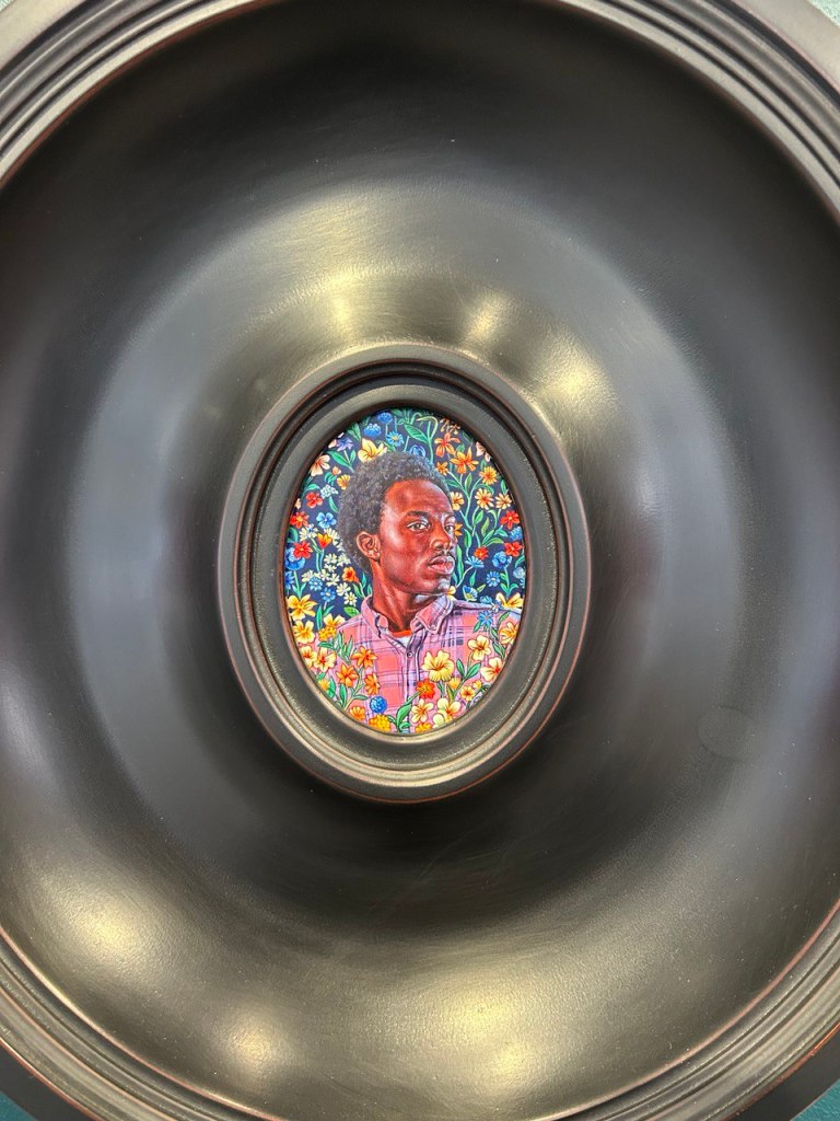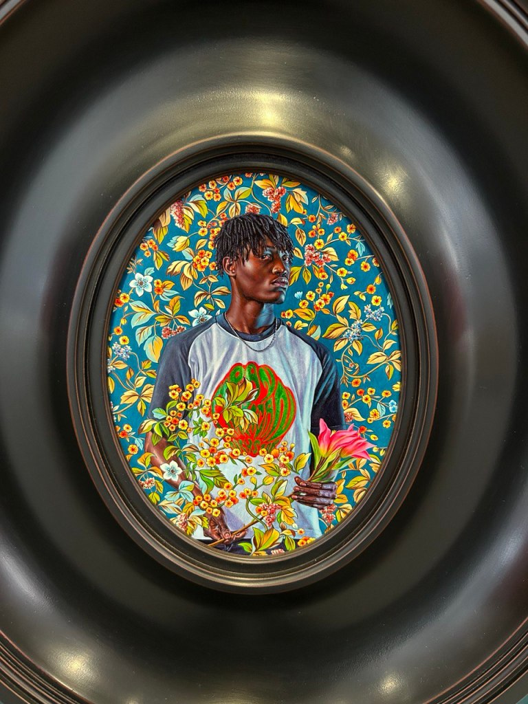 Les arrière-plans richement détaillés et floraux, typiques de la pratique de Wiley, sont omniprésents dans ces œuvres – c’est d’ailleurs ce qui me plaît énormément chez cet artiste. Il puise également son inspiration dans un intérêt continu pour les textiles et un mélange de styles d’époque, notamment le rococo français et les imprimés wax néerlandais. Les motifs botaniques vibrants enchevêtrent les sujets de Wiley et évoquent la grandeur des peintures des grands maîtres à travers leurs expressions et leurs poses. L’artiste dirige le regard du spectateur dans ces peintures miniatures en utilisant des cadres ovales et rectangulaires surdimensionnés, un style visuel extrêmement populaire au XVIIIe siècle, notamment dans les portraits.