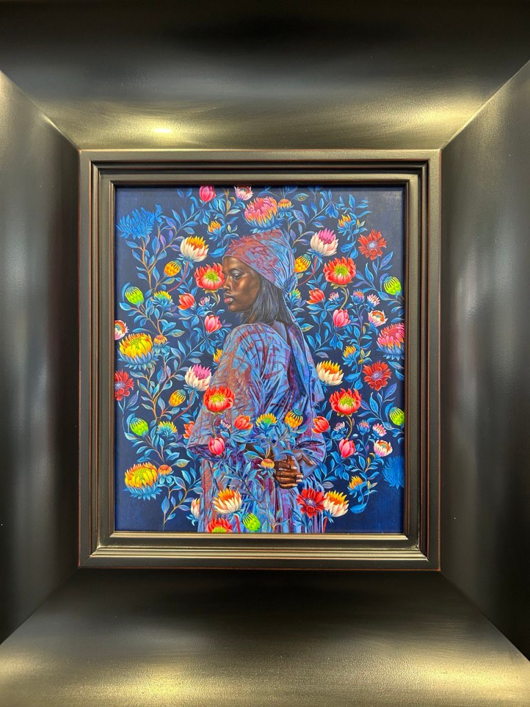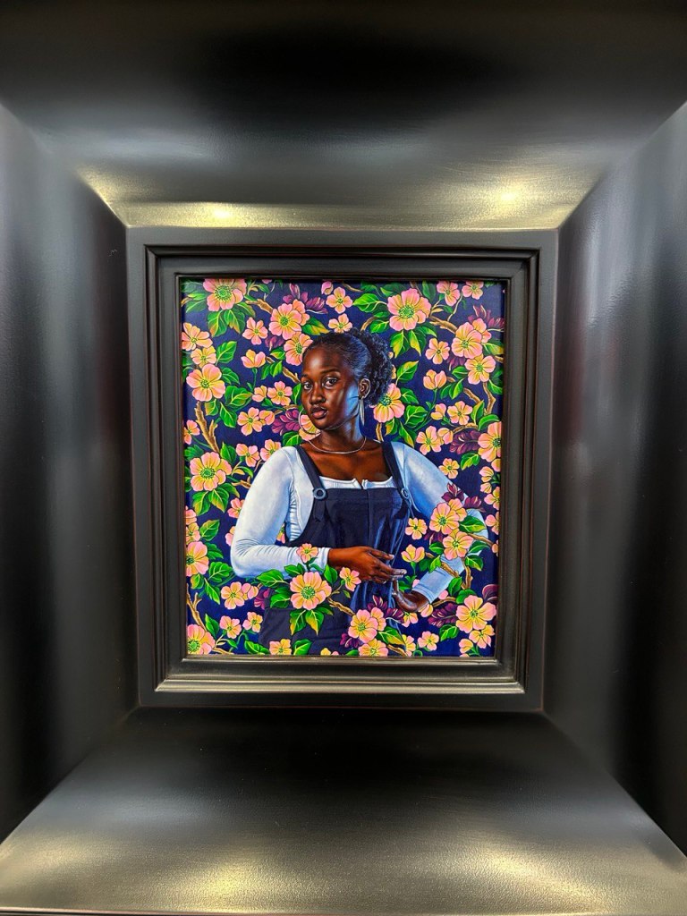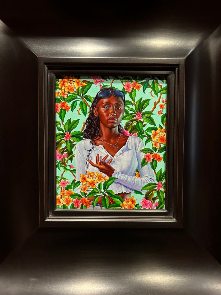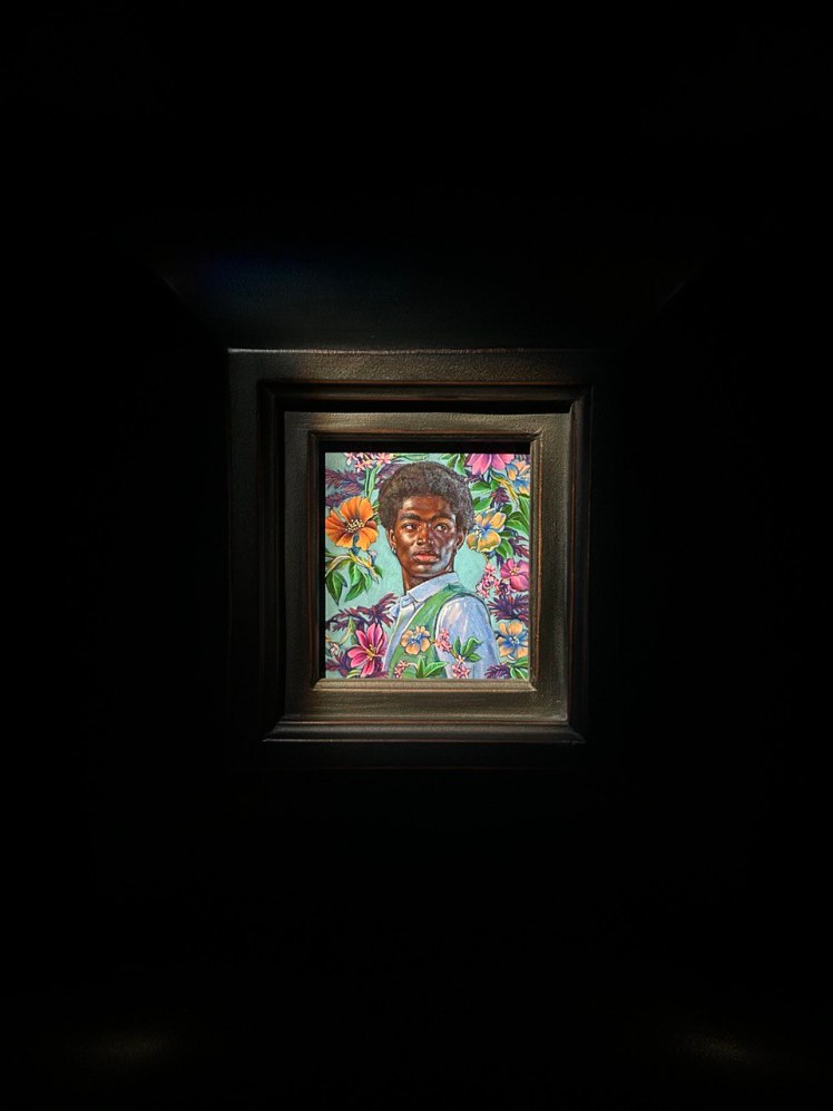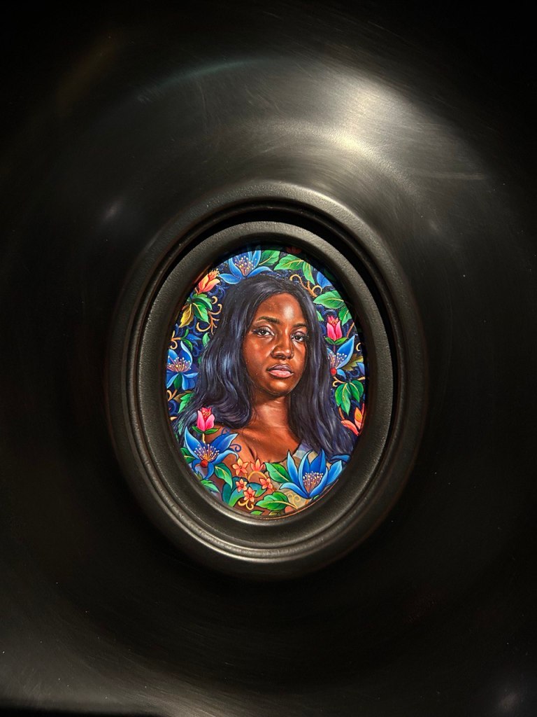Les arrière-plans richement détaillés et floraux, typiques de la pratique de Wiley, sont omniprésents dans ces œuvres – c’est d’ailleurs ce qui me plaît énormément chez cet artiste. Il puise également son inspiration dans un intérêt continu pour les textiles et un mélange de styles d’époque, notamment le rococo français et les imprimés wax néerlandais. Les motifs botaniques vibrants enchevêtrent les sujets de Wiley et évoquent la grandeur des peintures des grands maîtres à travers leurs expressions et leurs poses. L’artiste dirige le regard du spectateur dans ces peintures miniatures en utilisant des cadres ovales et rectangulaires surdimensionnés, un style visuel extrêmement populaire au XVIIIe siècle, notamment dans les portraits.