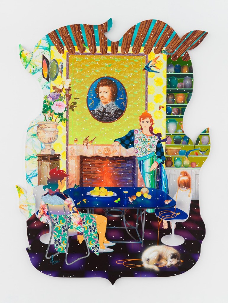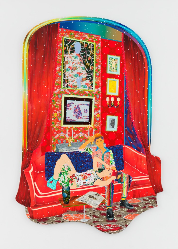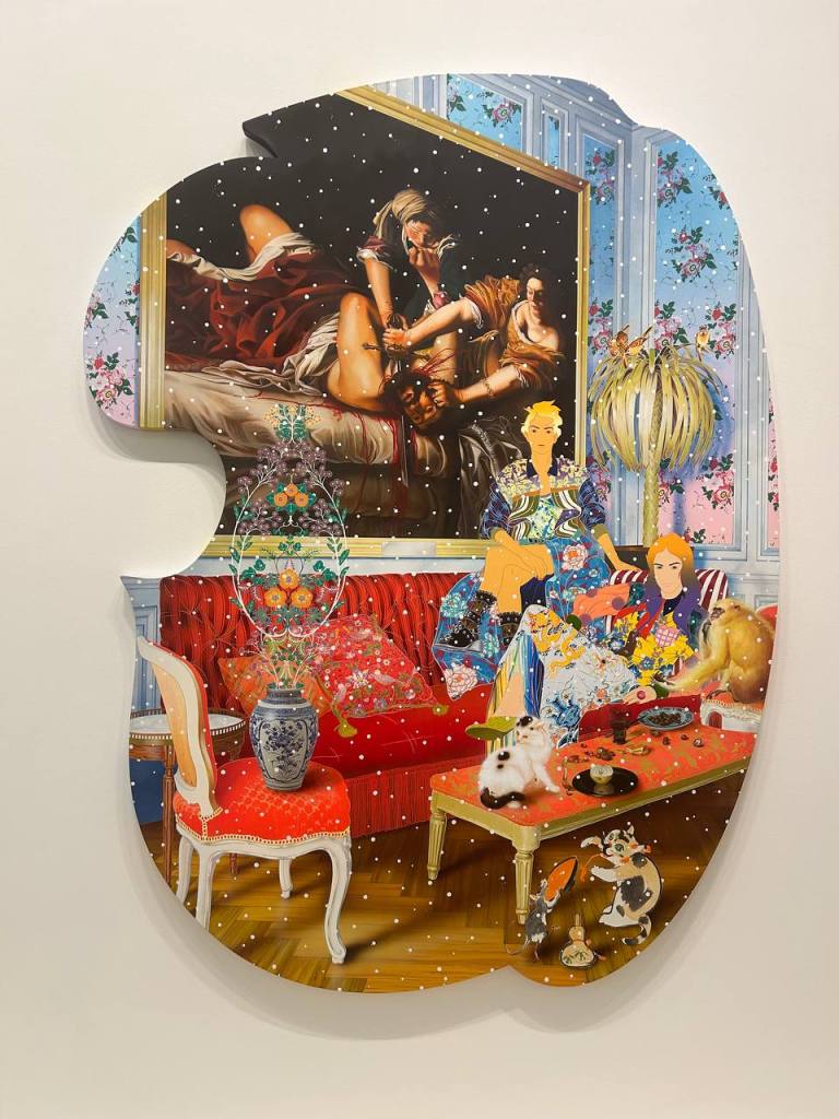 Au centre, un tableau classique inspiré de Judith décapitant Holopherne d’Artemisia Gentileschi est inséré dans une scène contemporaine. Ce choix crée une juxtaposition frappante entre le drame baroque de la scène historique et le confort domestique contemporain autour, notamment avec des fauteuils, un canapé et une décoration richement détaillée. Le tableau inséré rend hommage à l’art classique, particulièrement au caravagisme, en mettant en lumière des thématiques comme la violence et le triomphe. Autour de la scène principale, on trouve des figures et des objets colorés qui appartiennent clairement à un univers plus moderne et globalisé, comme le mobilier européen.