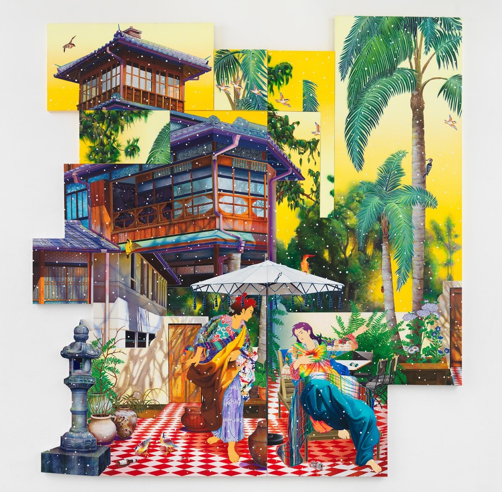 Selon les mots de l’artiste, il explore, à travers cette série « Fictional Landscape », le mélange des cultures et ses échanges, où tout semble fictif mais reflète pourtant la réalité de nos interactions mondiales complexes.