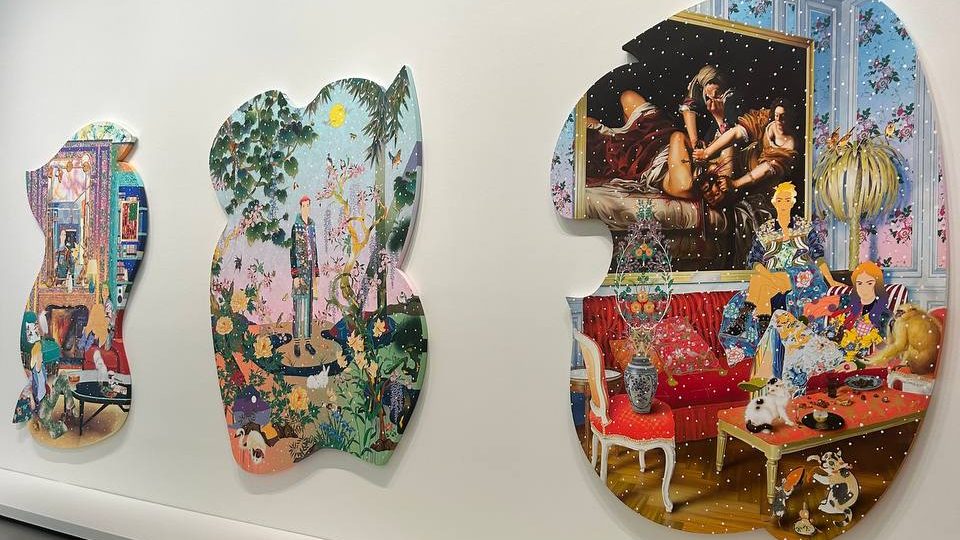 Points communs : Comme dans de nombreuses œuvres de Matsuyama, la forme organique des trois toiles dénote une rupture avec les formats rectangulaires traditionnels. Cette découpe inhabituelle donne une impression de fluidité et invite le spectateur à explorer l’œuvre au-delà des cadres conventionnels. Comme dans d’autres de ses œuvres, des points blancs ressemblant à des flocons de neige parsèment les images. La neige est un motif récurrent dans son travail, symbolisant à la fois l’impermanence (concept clé du bouddhisme) et une connexion poétique avec son héritage japonais. Ce motif crée également une dimension onirique. Enfin, les couleurs vives et saturées sont typiques du style de Matsuyama. Elles attirent immédiatement le regard et servent à équilibrer les multiples éléments de la composition.