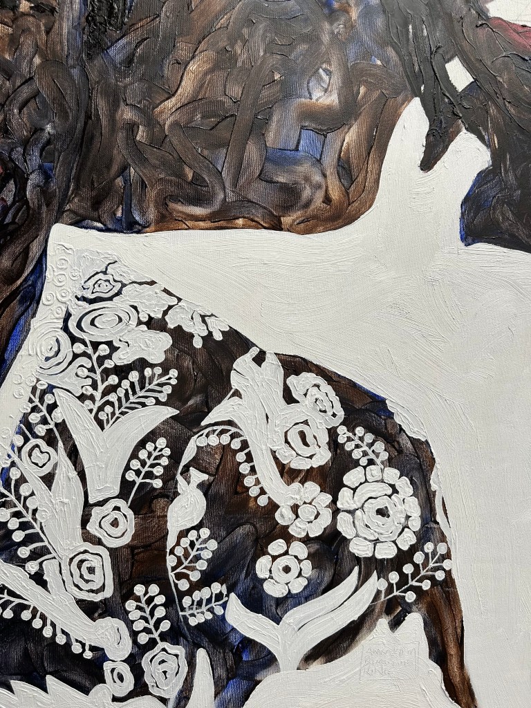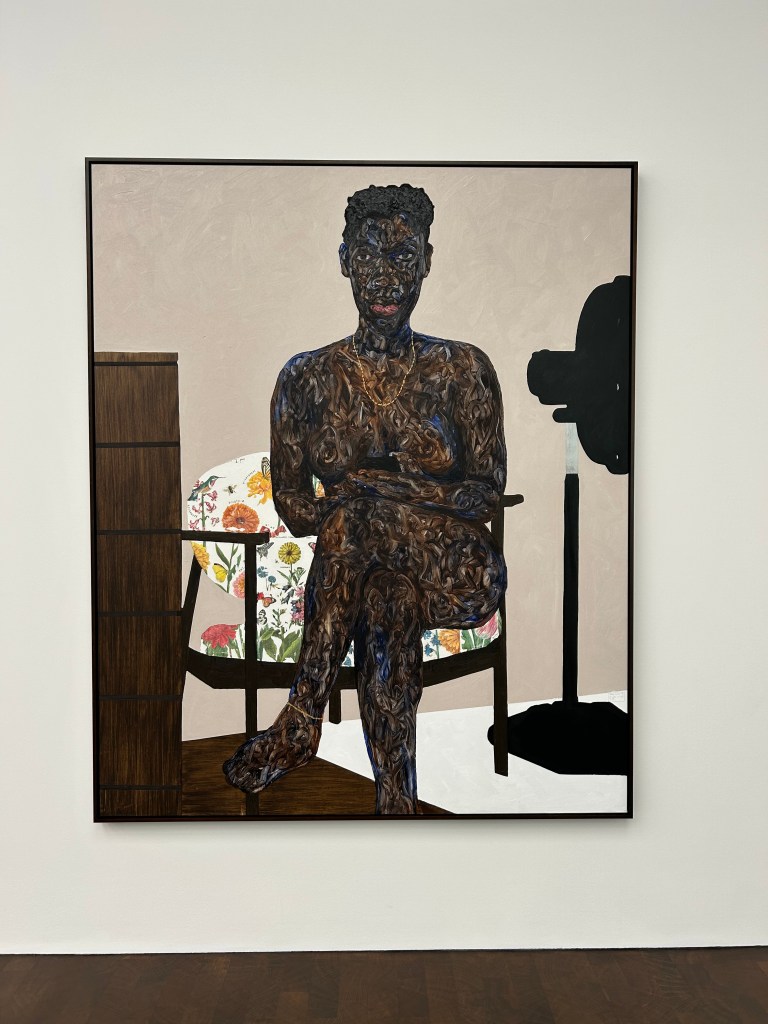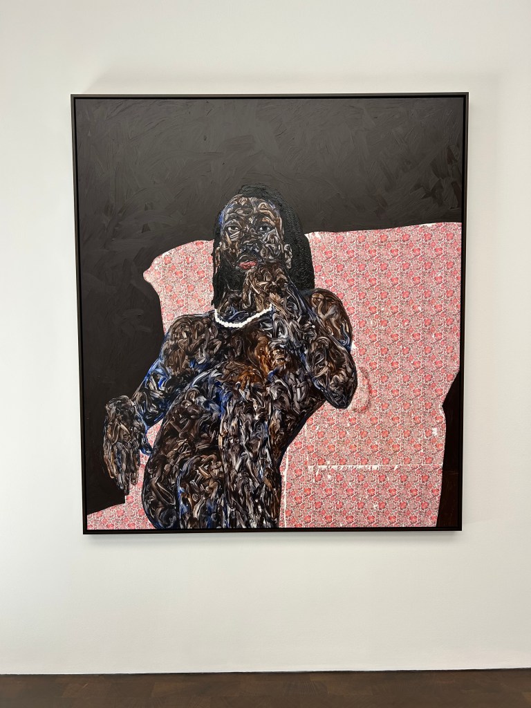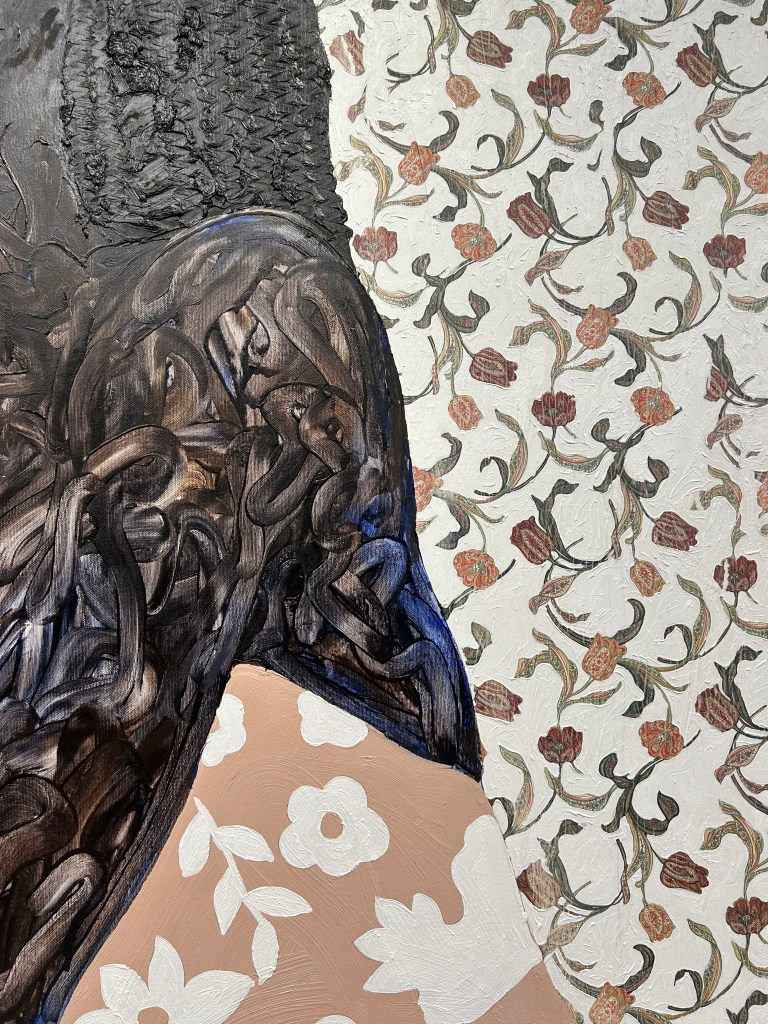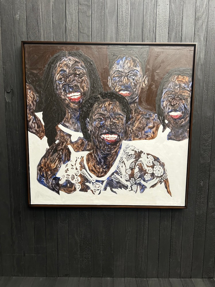 Le visuel de la peau, à travers ces traits bruns et sinueux couvrant les corps de ses sujets, est vraiment saisissant. L’aspect des cheveux frisés/crépus n’est pas en reste grâce à la texture qui donne du relief et un effet palpable. Lorsqu’on regarde de près les peintures, on se rend vite compte que la peau des figures n’est pas uniquement brune mais que des touches de bleu sont également présentes. Pourquoi la présence de ce bleu sur tous les sujets ? C’est à se demander si cela ne fait pas référence au terme utilisé au sein de la communauté noire pour désigner les différentes teintes de peau tel que le « Blue-black » : expression poétique ou argotique utilisée pour décrire une peau noire très foncée avec des reflets bleutés. Sa connotation est double, elle peut être utilisée pour valoriser une certaine beauté noire très foncée dans une logique de réappropriation, mais a aussi pu être utilisée péjorativement dans des contextes racistes ou moqueurs. Évidemment, avec Boafo, on se doute bien qu’il s’agirait de la première connotation positive dans une démarche de revalorisation.