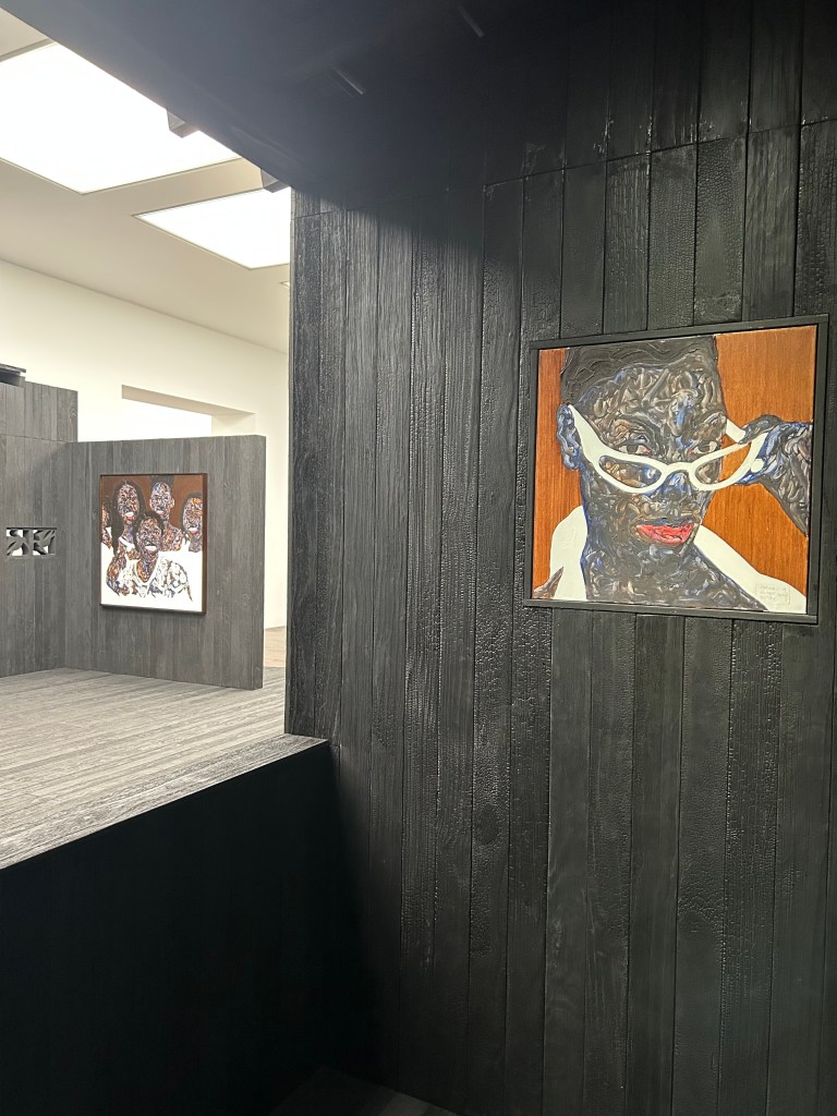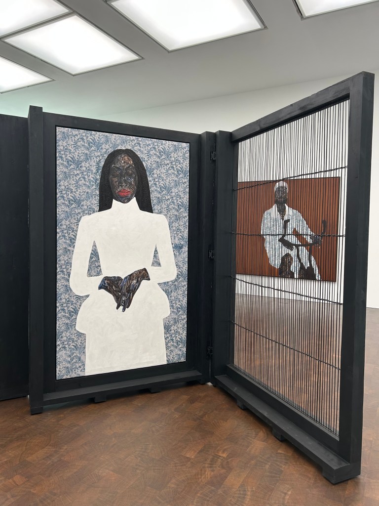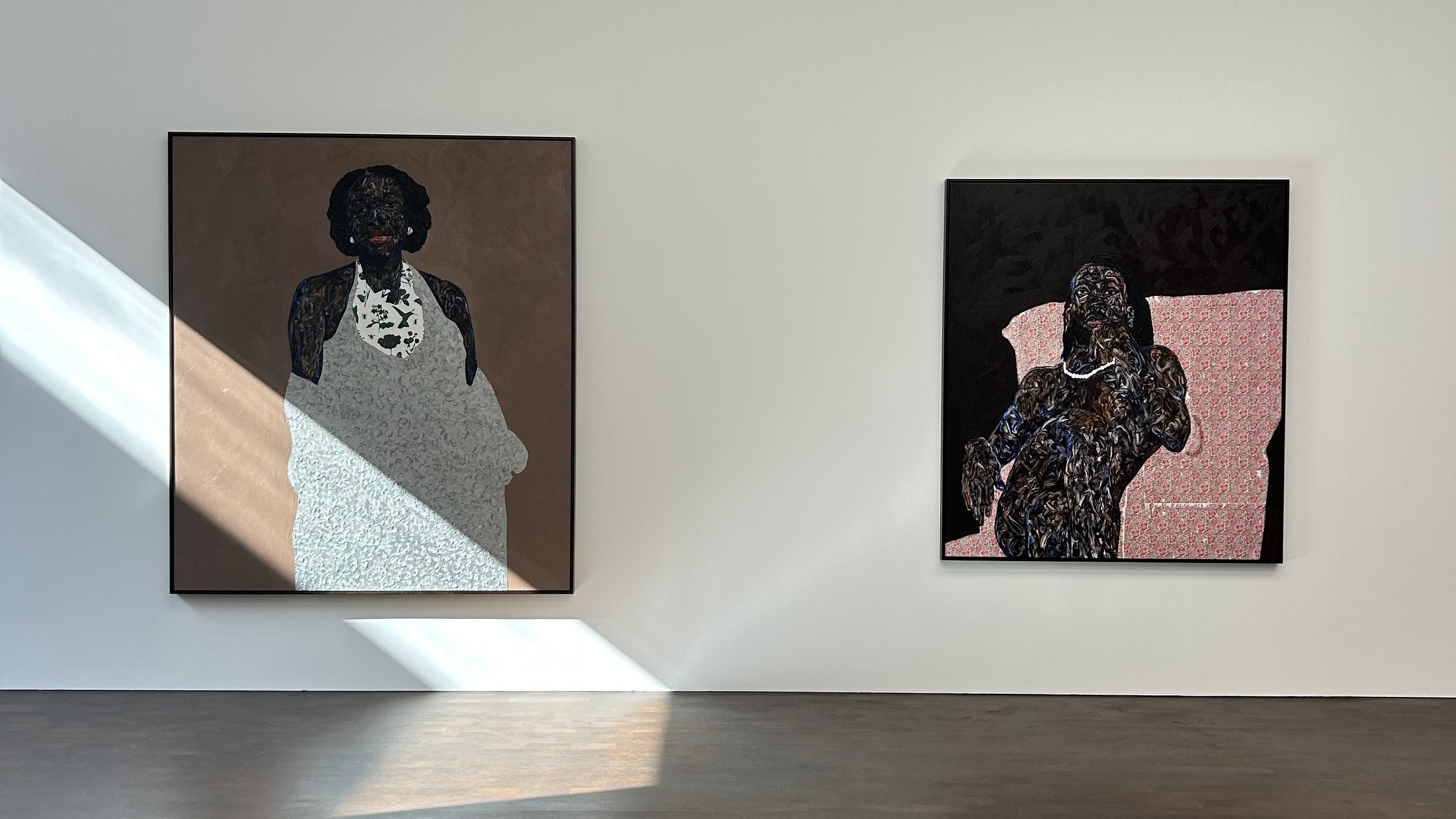Une alliance entre art et architecture prend forme au sein de l’espace. En effet, l’exposition présente la première peinture autoportante double face de l’artiste : deux figures féminines grandeur nature posées dos à dos sur des panneaux de bois pliants. L’œuvre réinvente le nkyinkyim, symbole Adinkra qui représente les aléas de la vie et, par conséquent, la résilience et la persévérance des personnages de Boafo face à un monde social tumultueux.