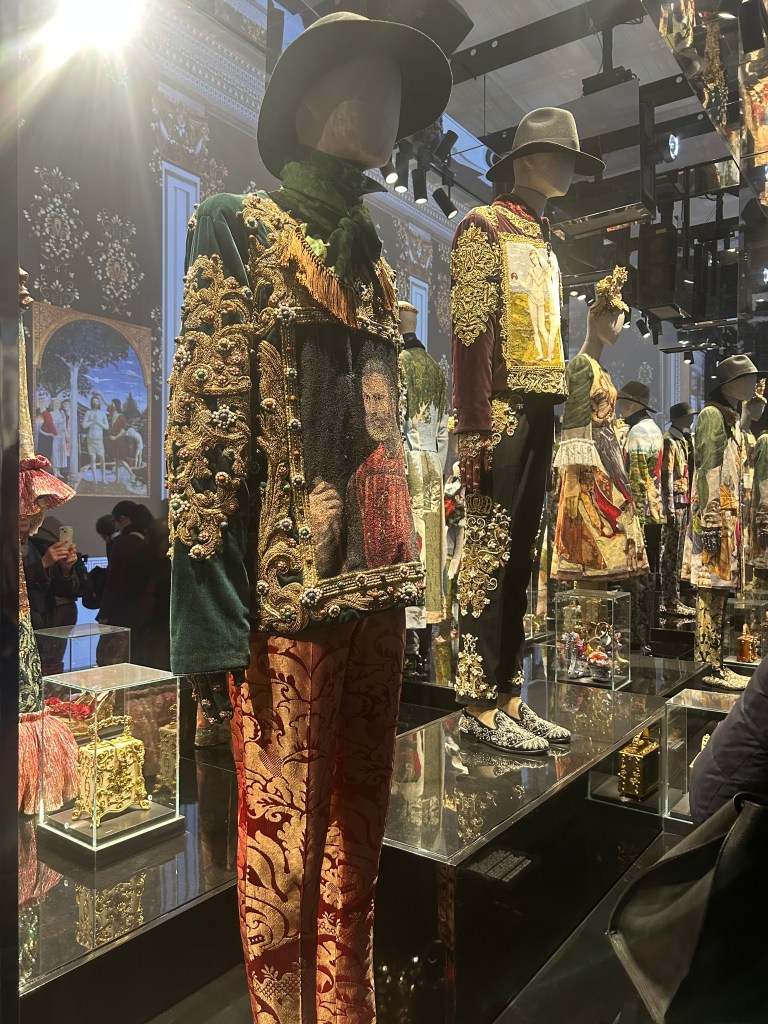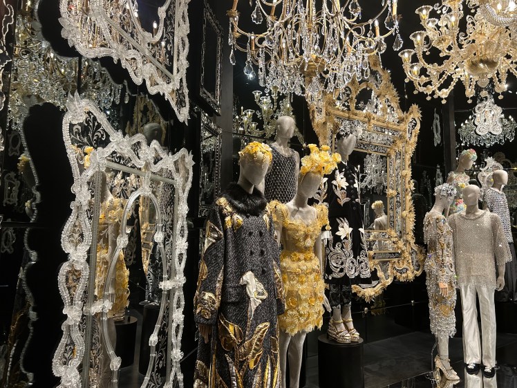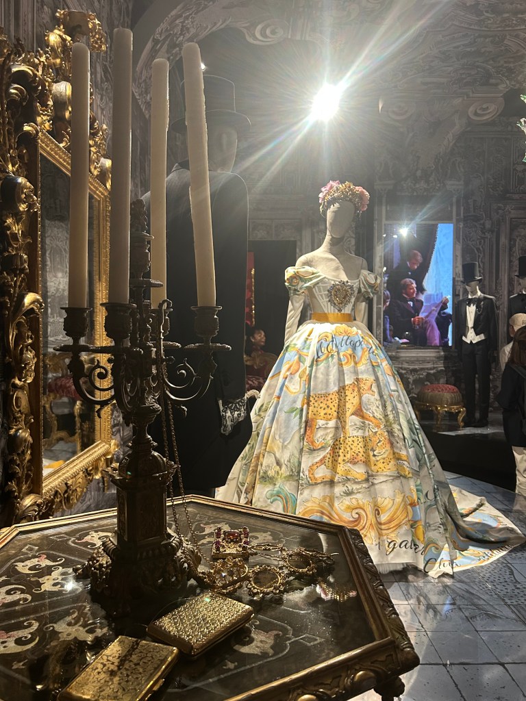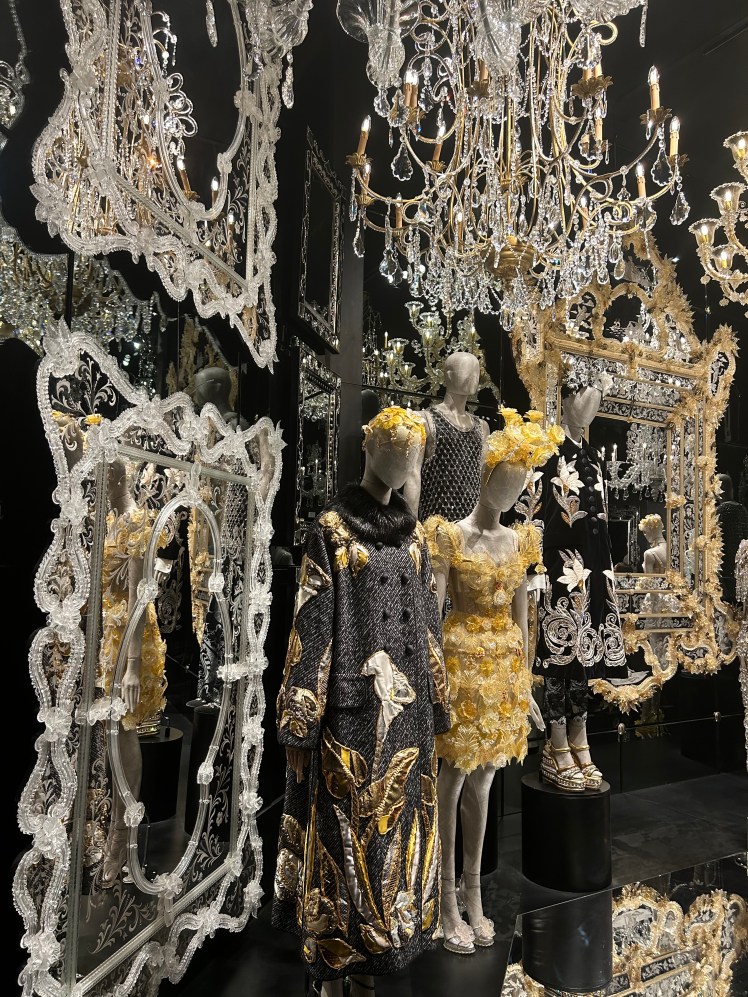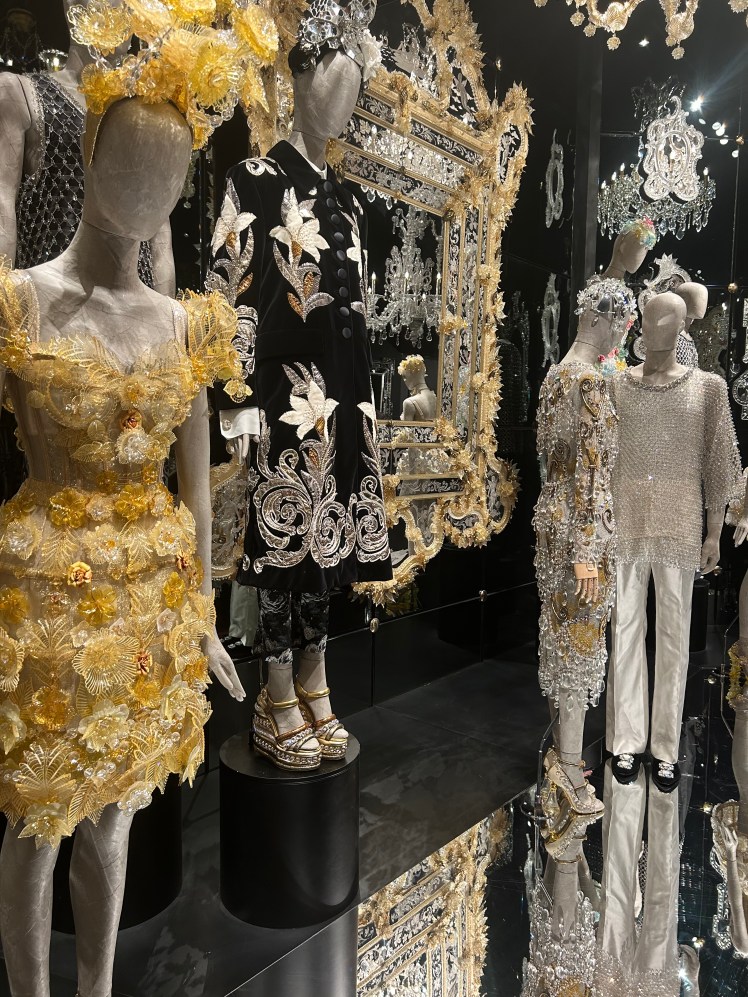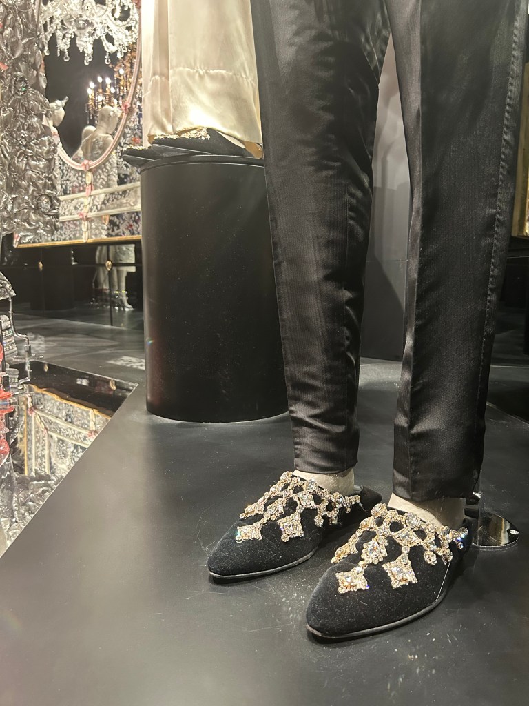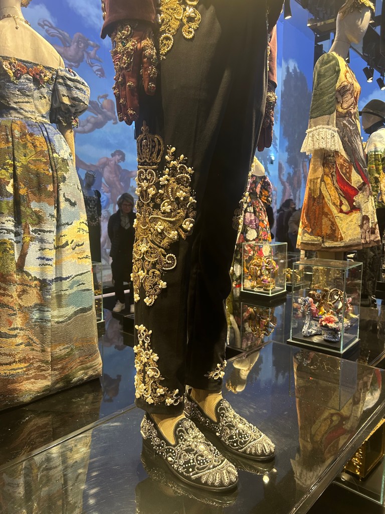 Chaque salle est dédiée à un thème, nous montrant la diversité, l’imagination débordante et la création infinie dont font preuve les deux couturiers. A l’instar des vêtements, les salles sont décorées de manière maximaliste (profusion d’ornements) de telle sorte que la scénographie viendrait presque à rivaliser avec les créations. A chaque nouvel espace, nous sommes immergés dans un univers flamboyant où mocassins, vestons en sequin, robes à dentelle et pantalons en velours se rencontrent. On peut affirmer qu’avec Dolce&Gabbana nous sommes apprêtés de la tête jusqu’au bout des pieds !