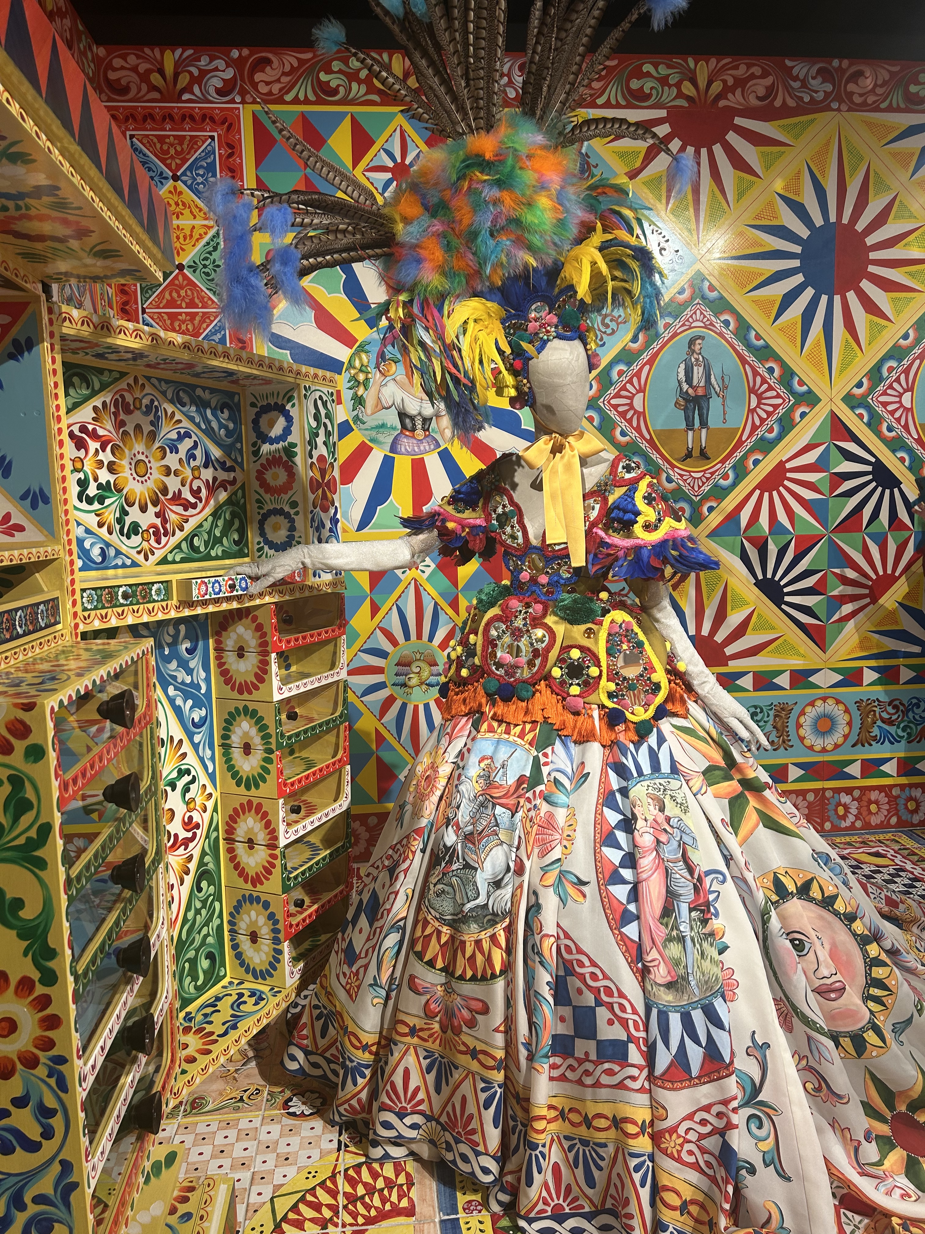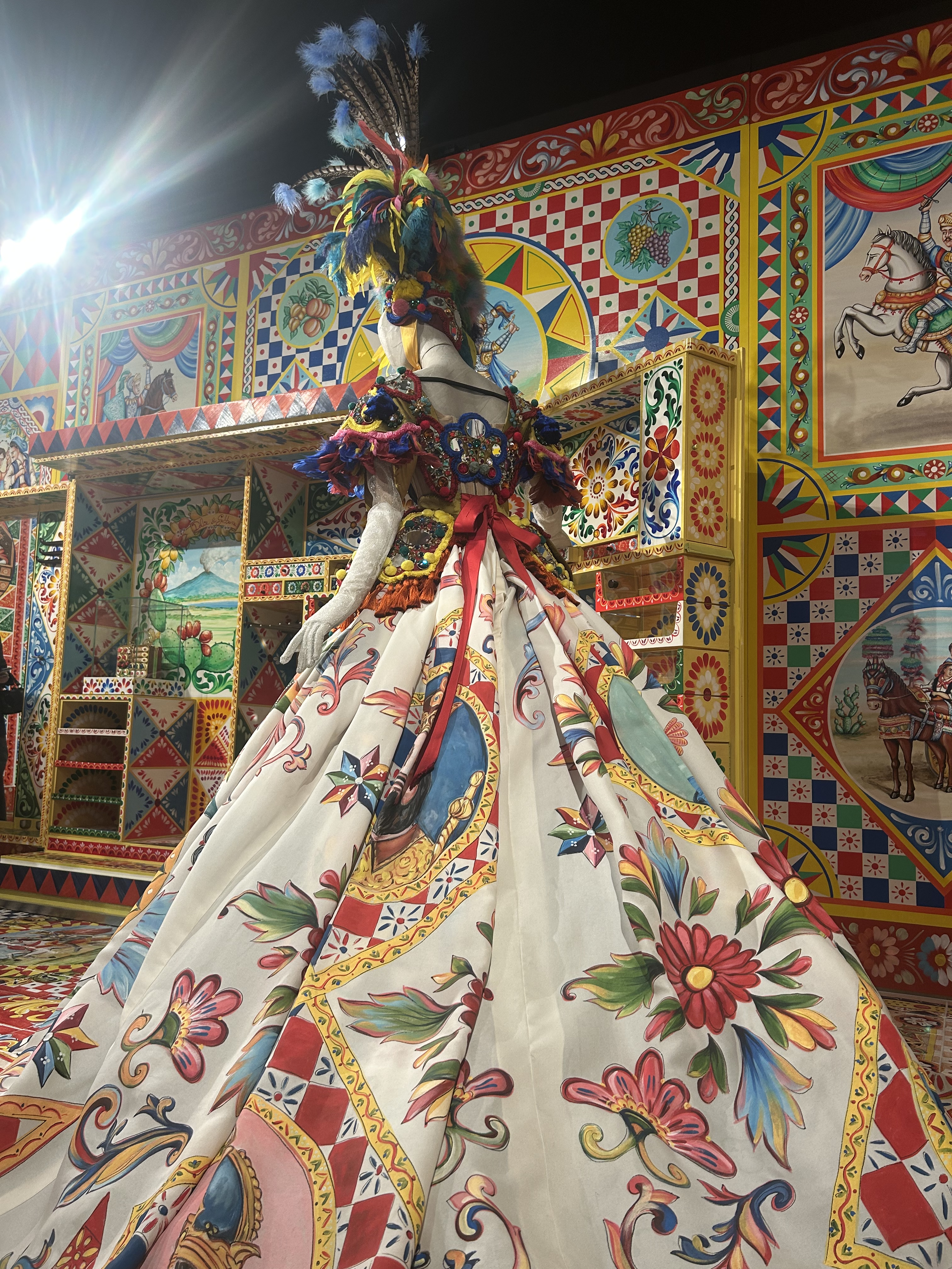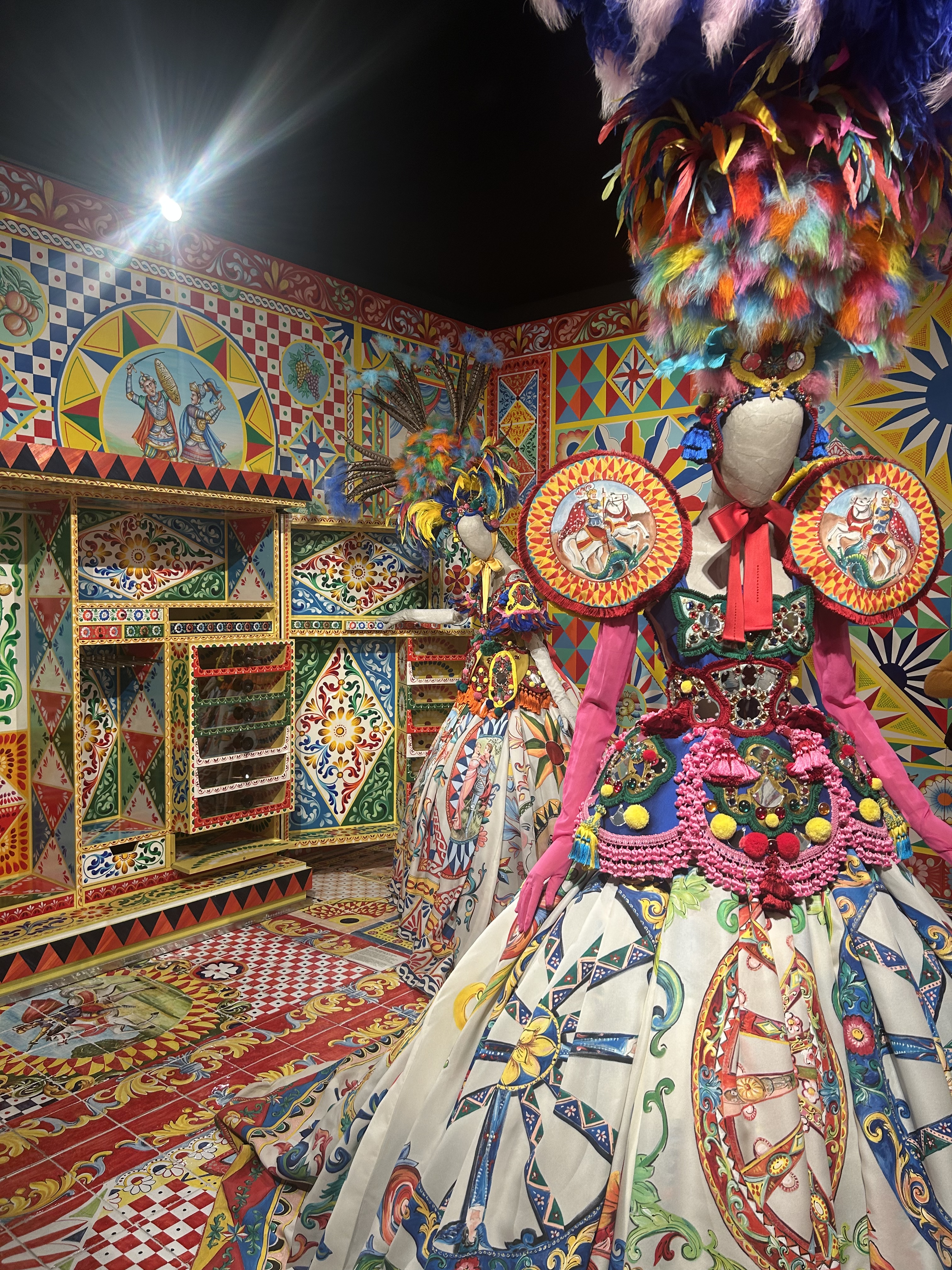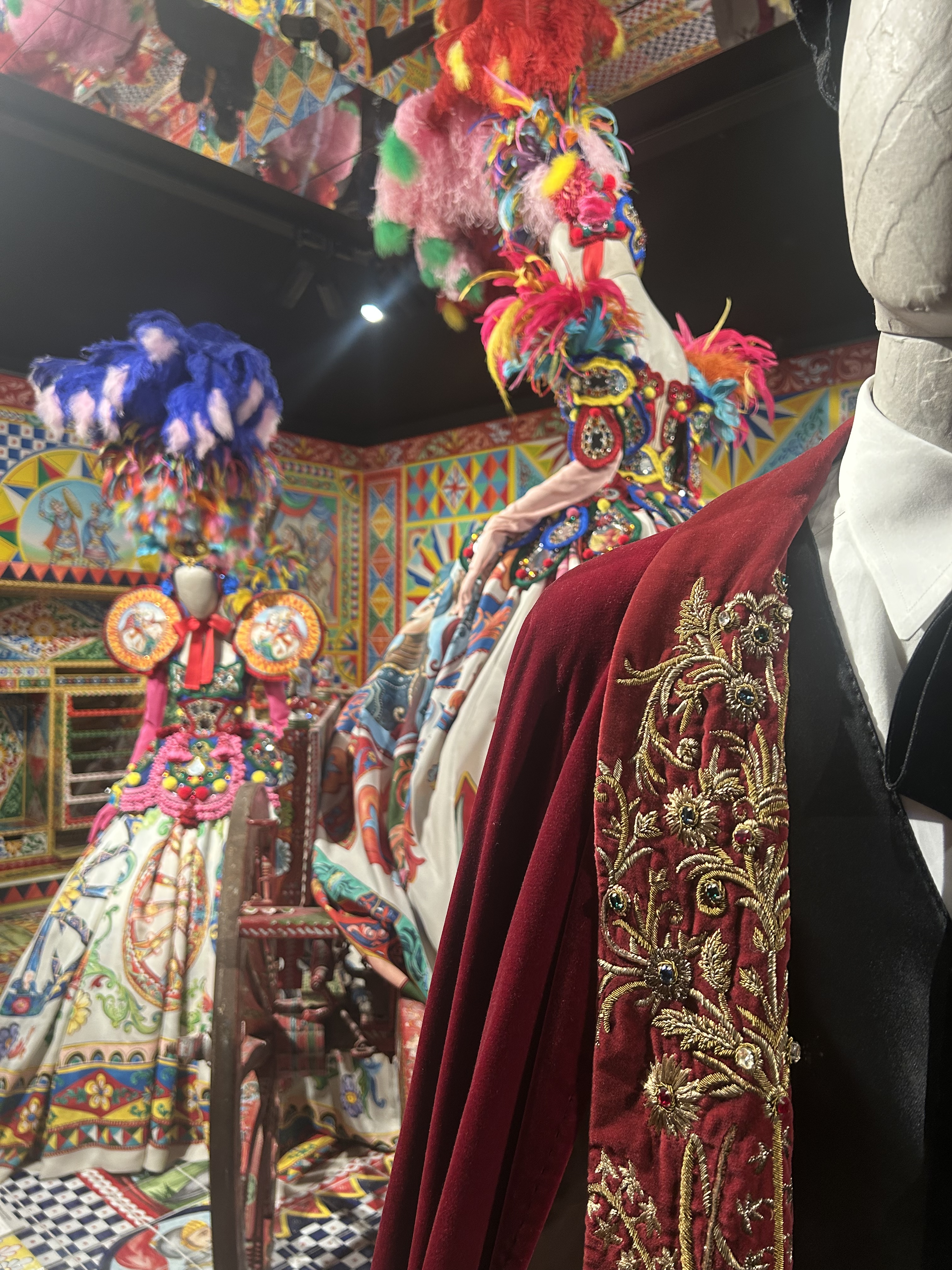 Chaque salle est dédiée à un thème, nous montrant la diversité, l’imagination débordante et la création infinie dont font preuve les deux couturiers. A l’instar des vêtements, les salles sont décorées de manière maximaliste (profusion d’ornements) de telle sorte que la scénographie viendrait presque à rivaliser avec les créations. A chaque nouvel espace, nous sommes immergés dans un univers flamboyant où mocassins, vestons en sequin, robes à dentelle et pantalons en velours se rencontrent. On peut affirmer qu’avec Dolce&Gabbana nous sommes apprêtés de la tête jusqu’au bout des pieds !