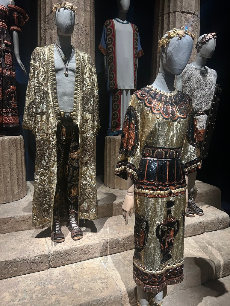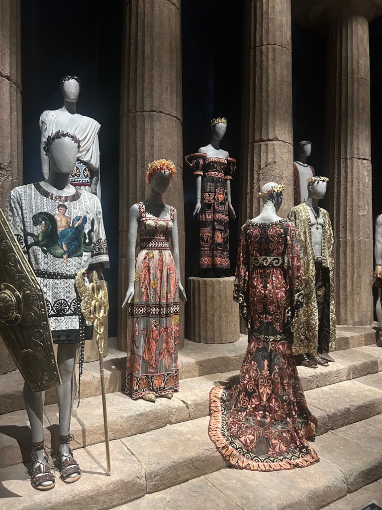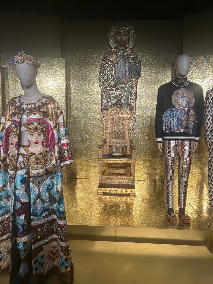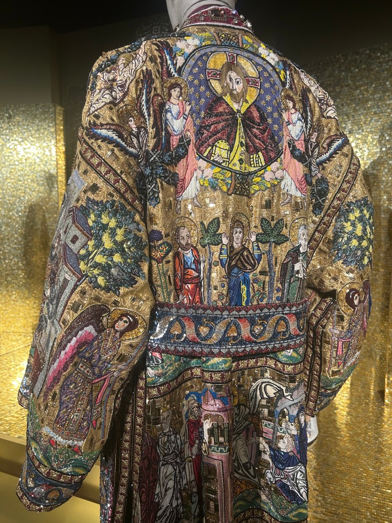 C’est un voyage dans le temps que nous propose le parcours car nous retournons bien loin dans le passé, entre colonnes antiques et mosaïques byzantines. Les reliques sacrées et divers éléments religieux sont réinterprétés à travers des pièces magistrales qui marient tradition et modernité. Nous croisons tout au long du chemin des silhouettes inspirées de reines, de rois, de dieux et de déesses.