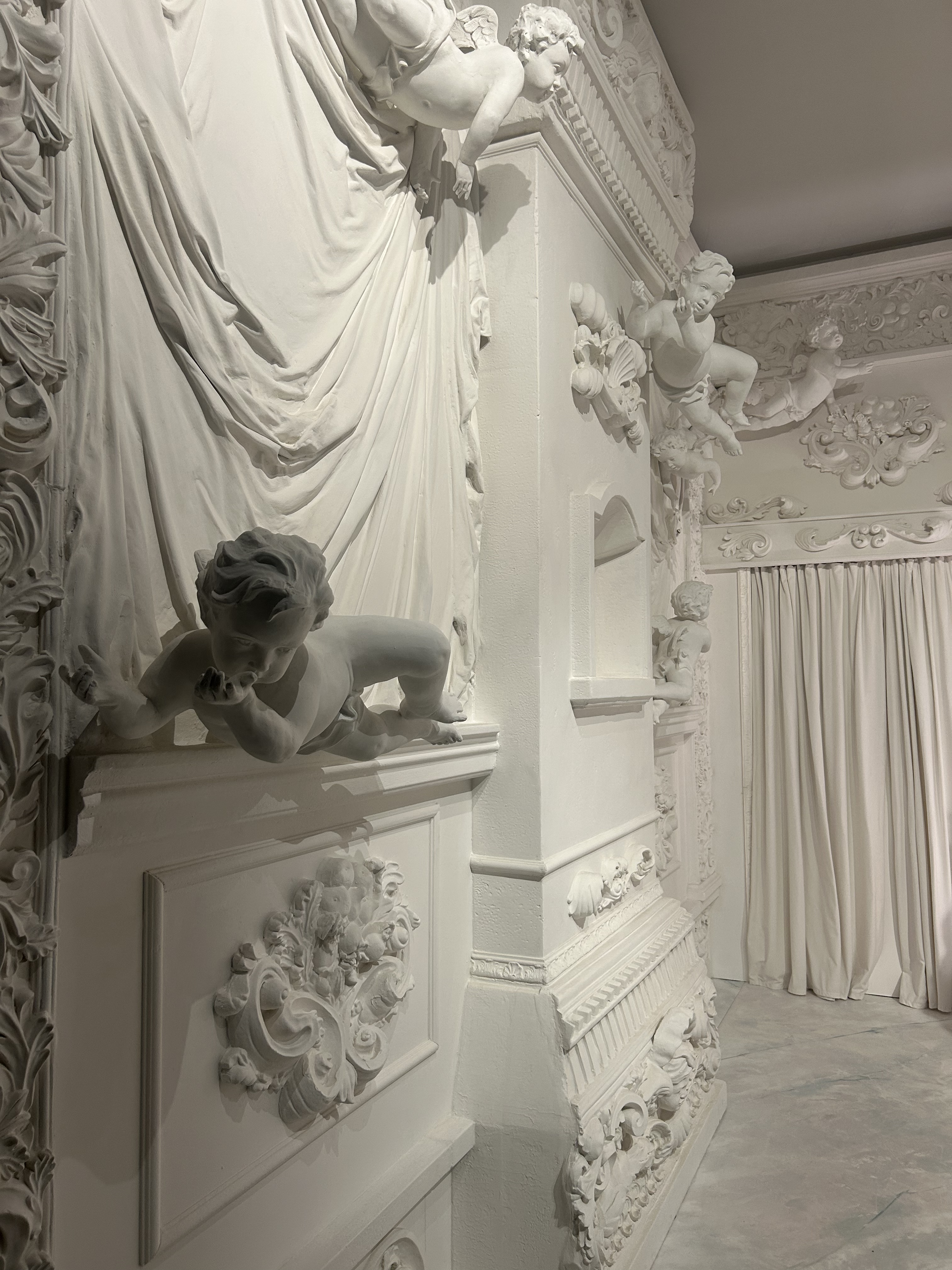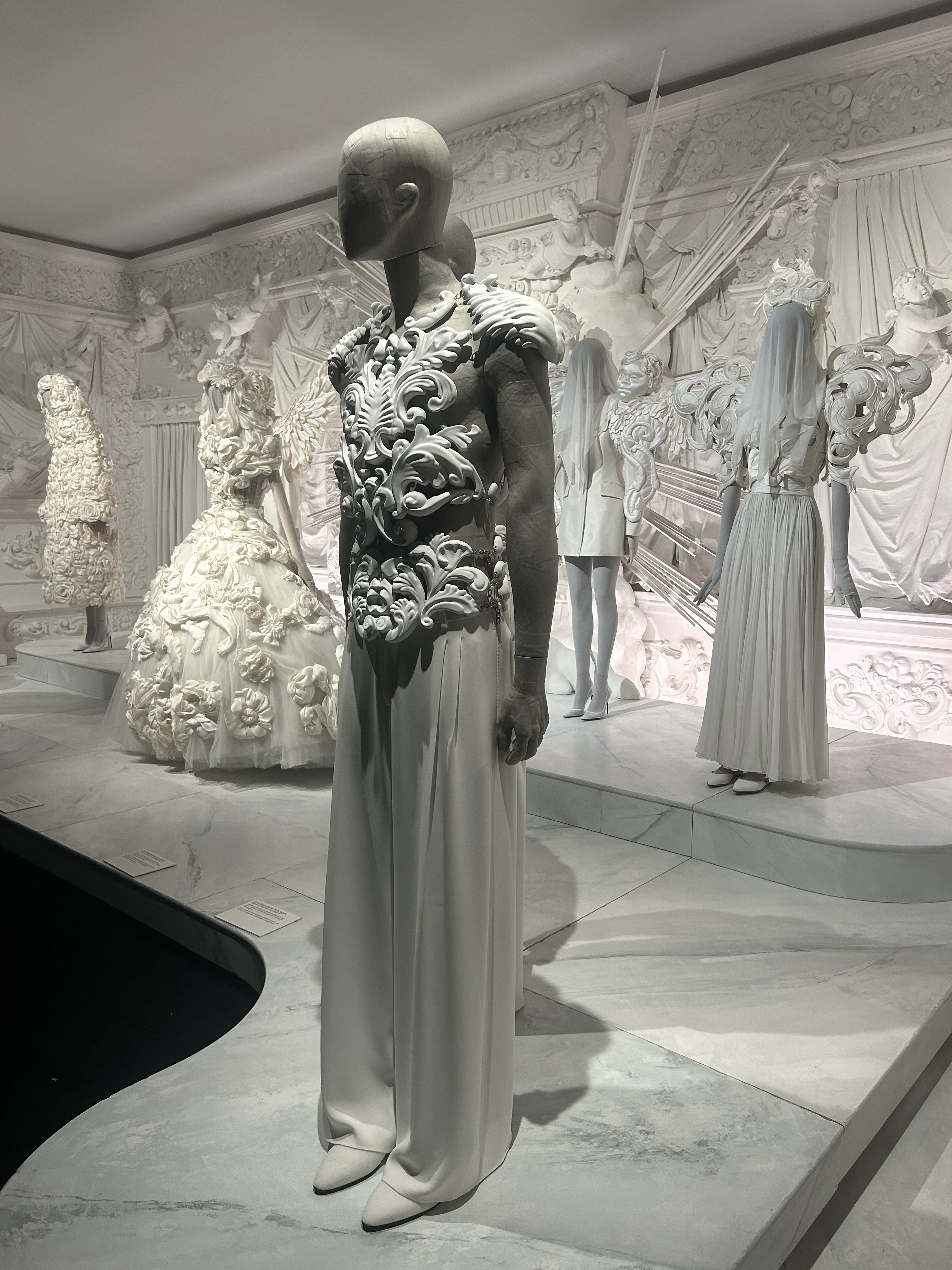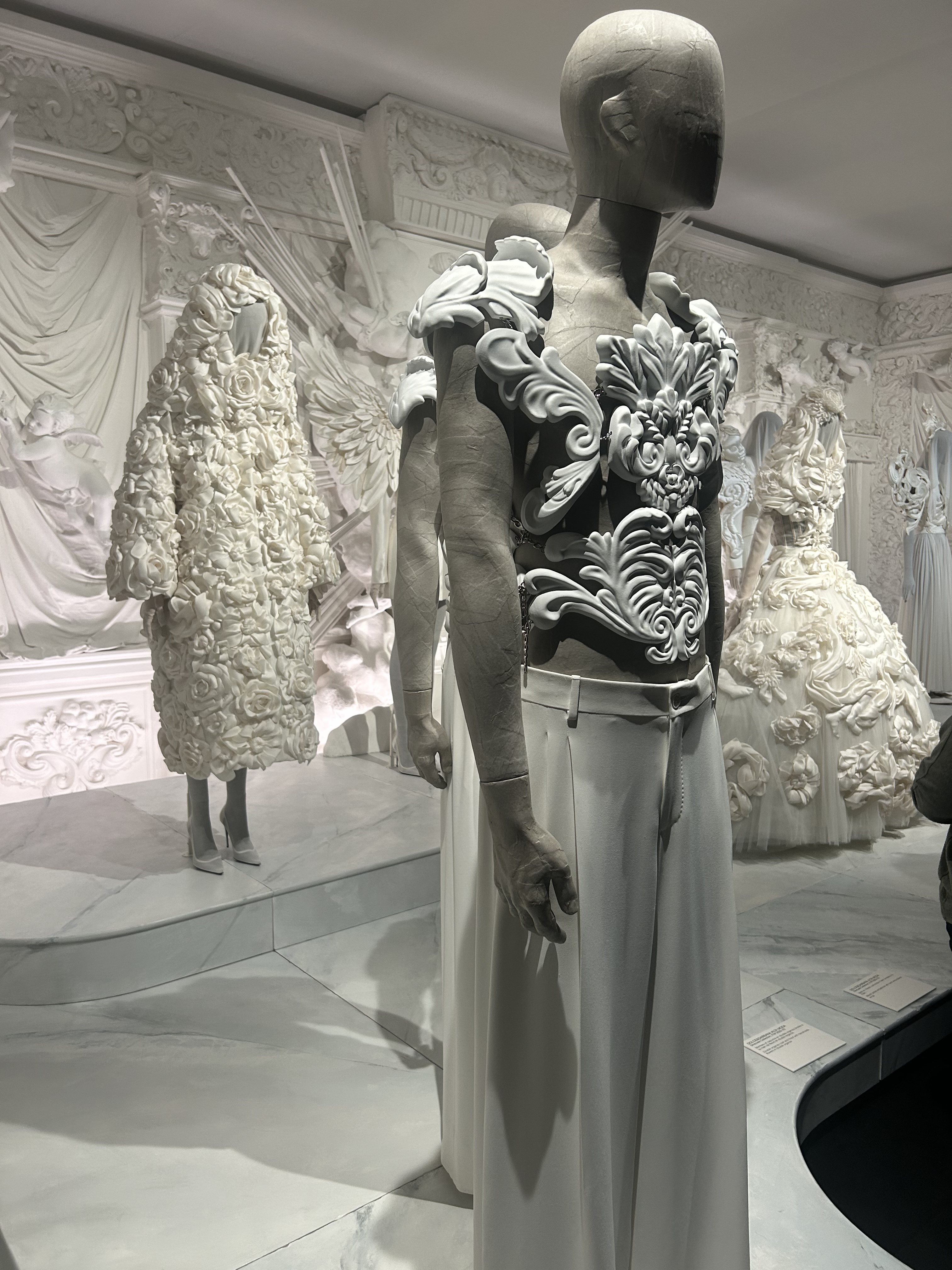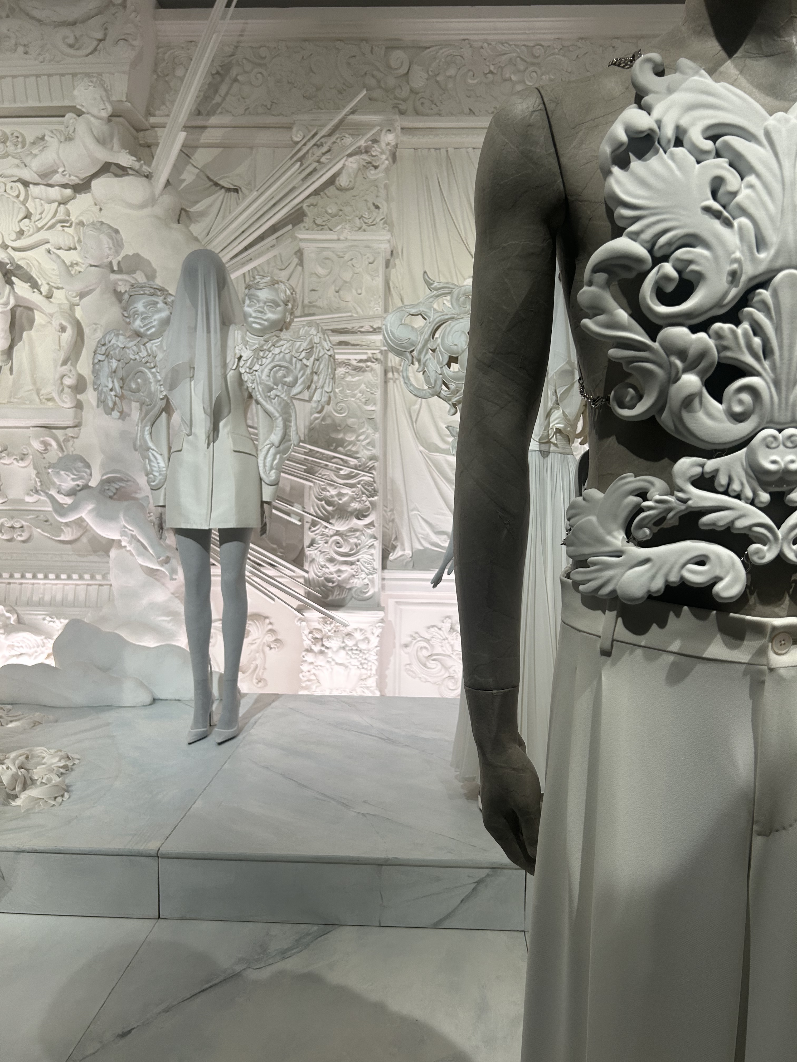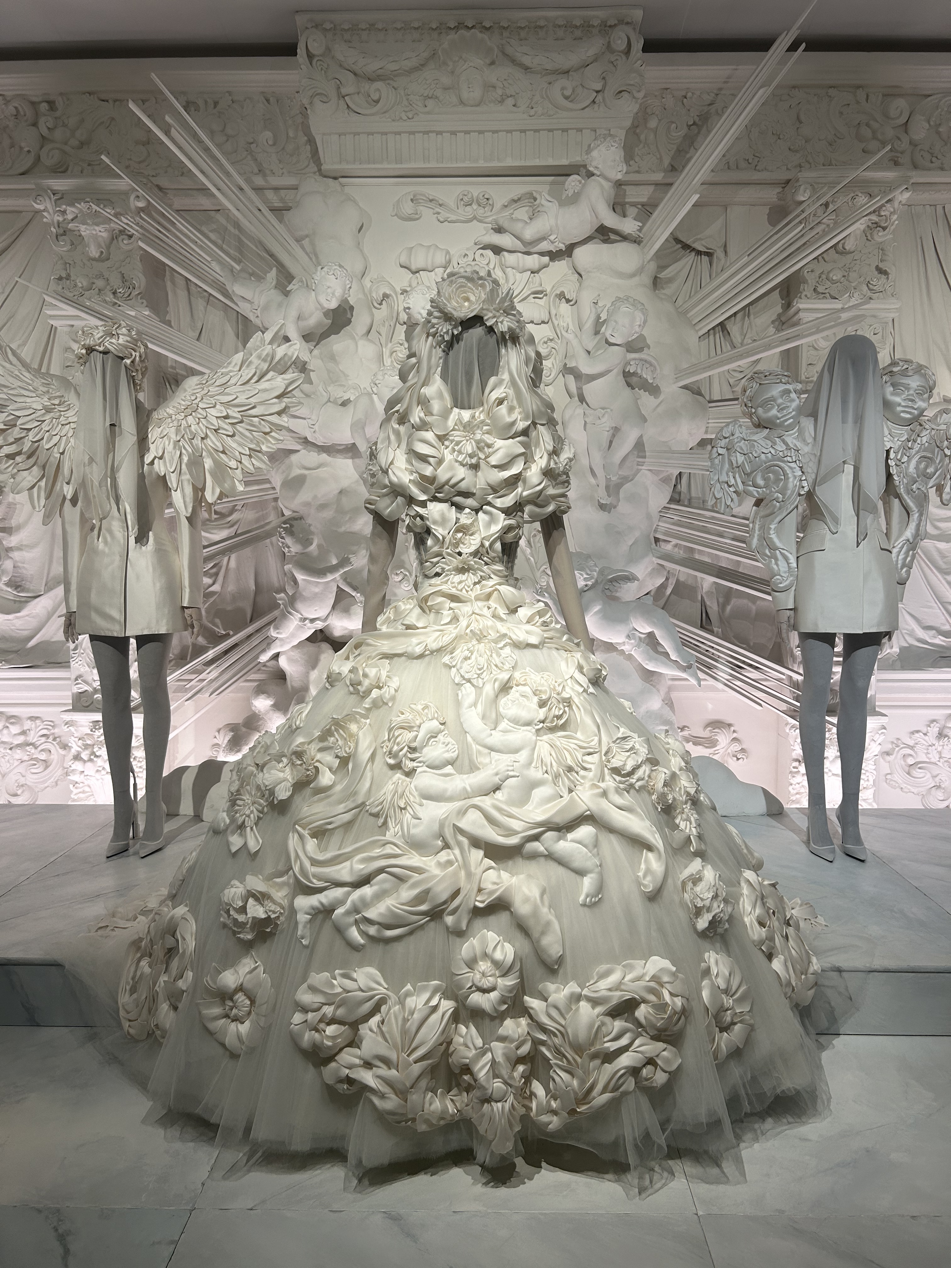 L’une de mes salles préférées est certainement celle au style baroque entièrement immaculée de blanc. Ici, les créations ne ressemblent pas moins à des vêtements qu’à des sculptures. Parmi les chérubins, nous avons l’impression d’être comme projeté dans un endroit céleste. Les pièces étant faites tout de volumes et de reliefs, nous nous demandons bien où peut se cacher Le Bernin ? (En effet, le décor sculptural à l’arrière-plan n’est pas sans rappeler celui de la Basilique Saint-Pierre de Rome).
