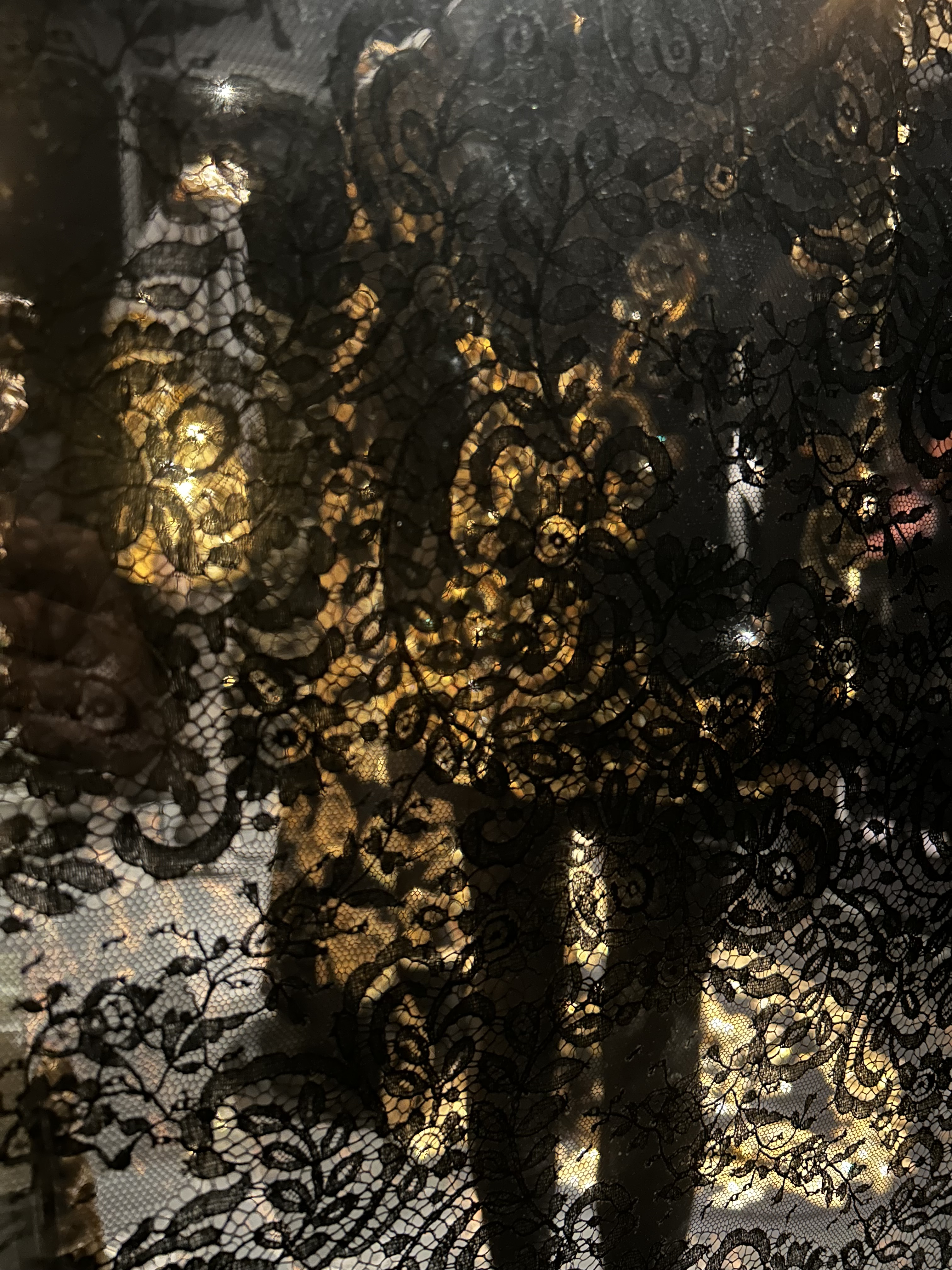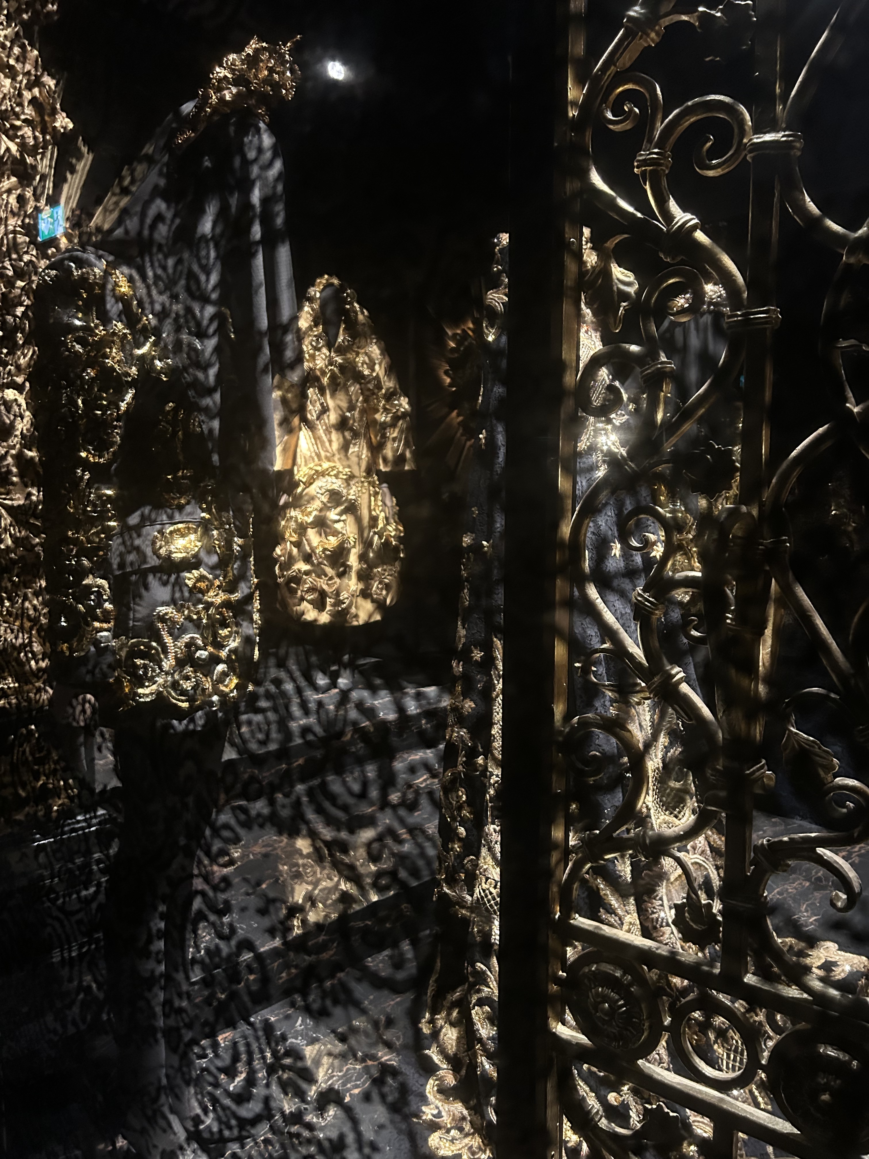 La dimension de sacré prend une place prépondérante dans leur travail. Dans la suite du parcours, nous découvrons une « cage » en dentelle qui renferme en son sein d’éblouissantes broderies au fil d’or. Nous pourrions presque l’appeler la cage au soleil, évoqué par les rayons dorés qui jaillissent de la sculpture en arrière-plan. Bien que les créations soient opulentes, l’association du noir et du doré leur confère une élégance sans pareil.