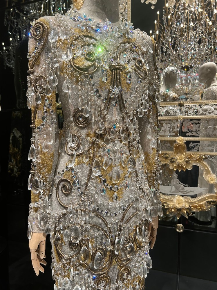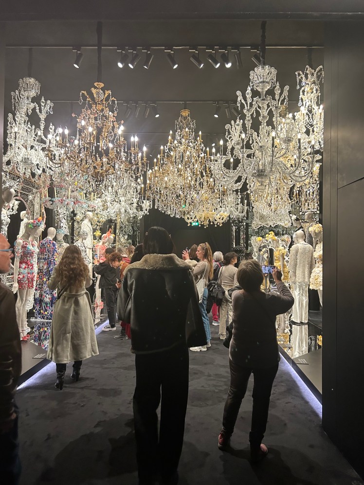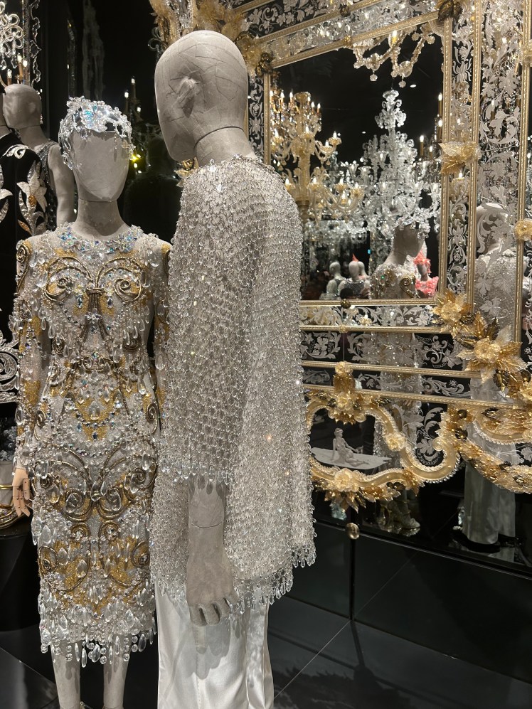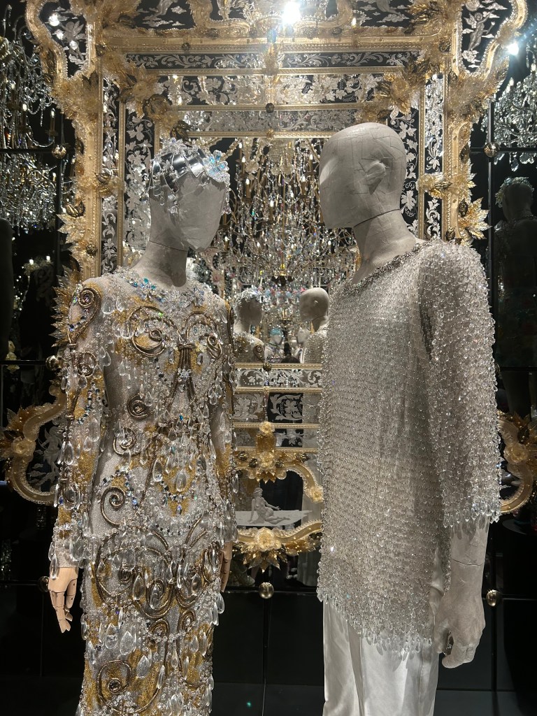 Nous terminons ce parcours dans ma salle préférée qu’on pourrait appeler celle des glaces. Sommes-nous tombés dans le trou du lapin ou passés de l’autre côté du miroir comme dans Alice au Pays des Merveilles ? Car c’est tout à fait l’ambiance qu’évoque cette pièce avec ses miroirs et lustres par « millier ». De plus, on peut y entendre des bruits de brisures de verre, dramatisant davantage la mise en scène. L’ornementation est à son comble et nous éblouit la vue. Ici, les tenues semblent être faites avec des éclats de verre, couvertes de brillants, cristaux et autres imitations de pierres précieuses.