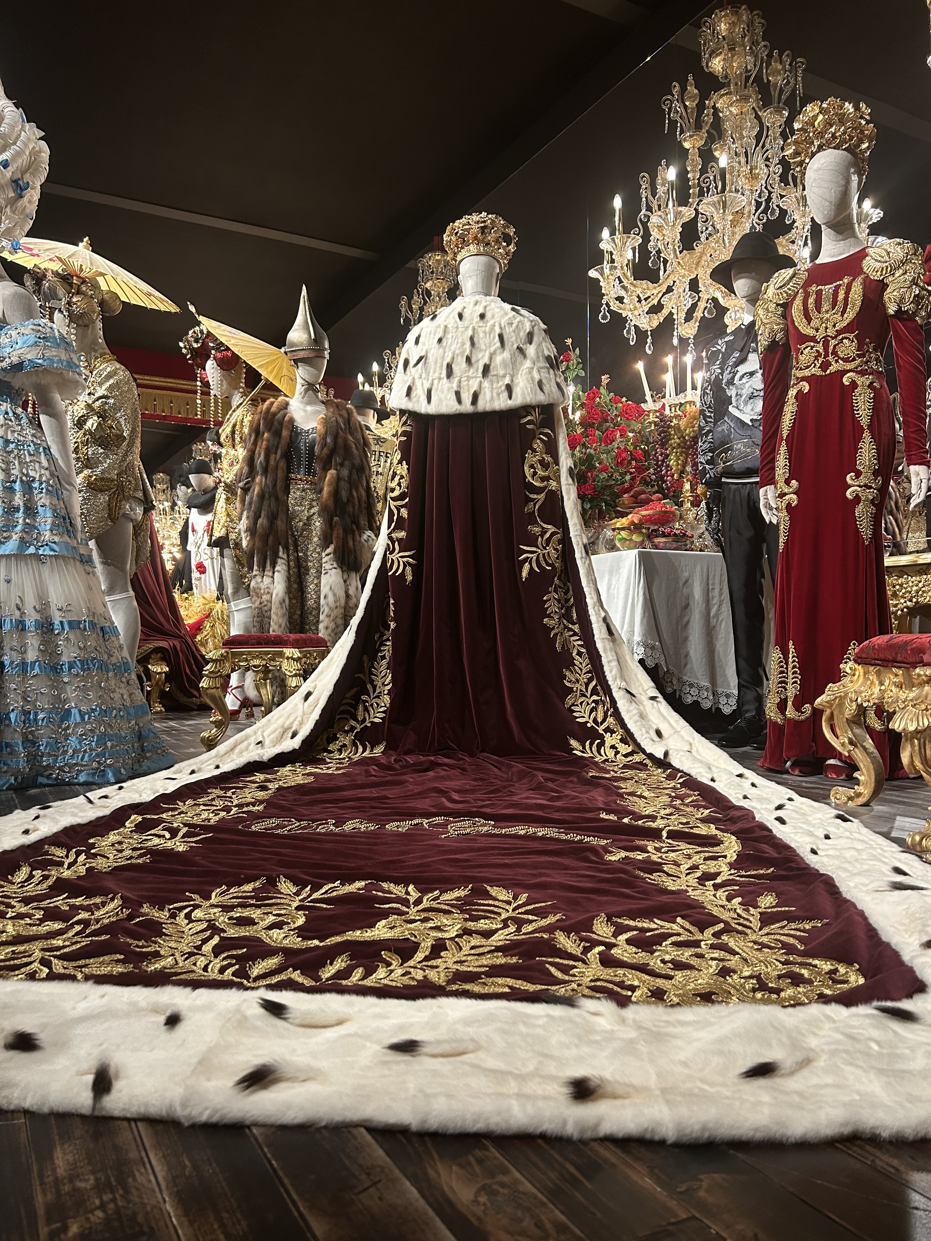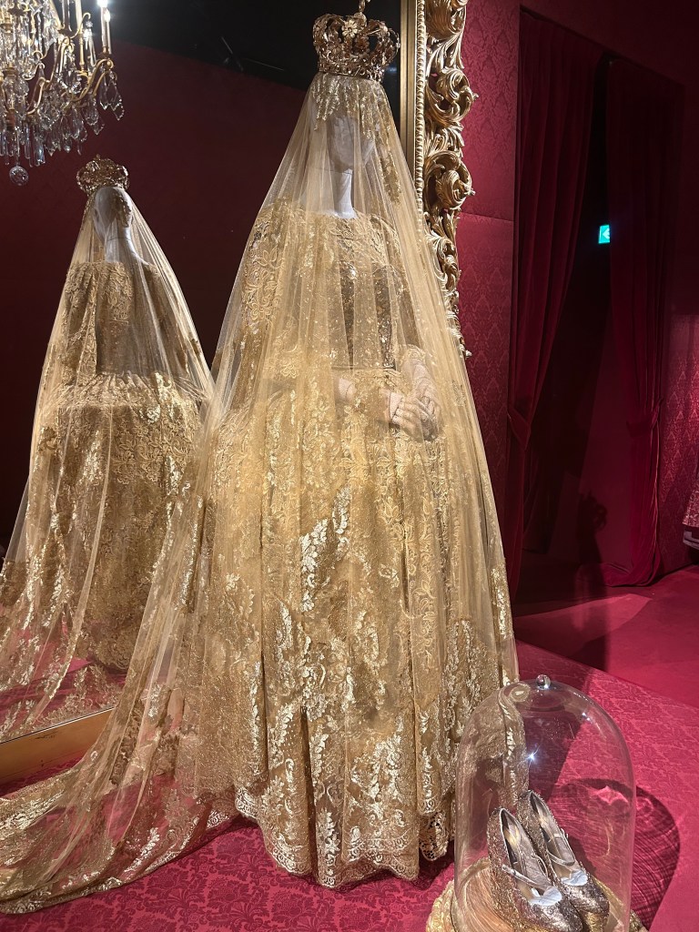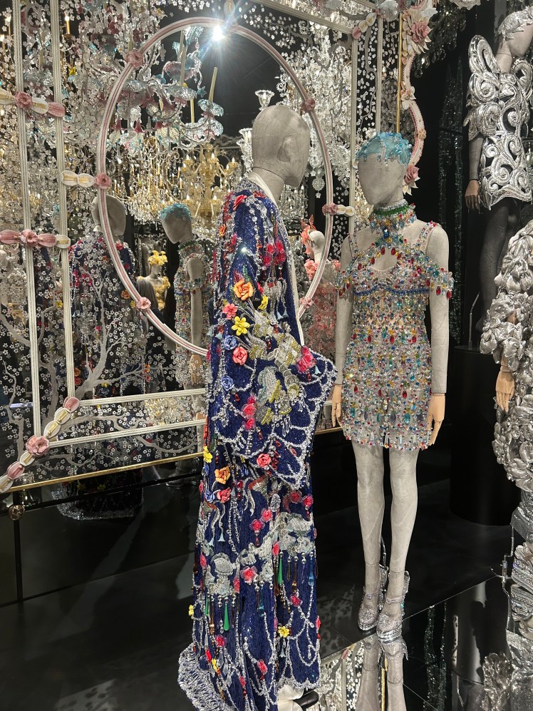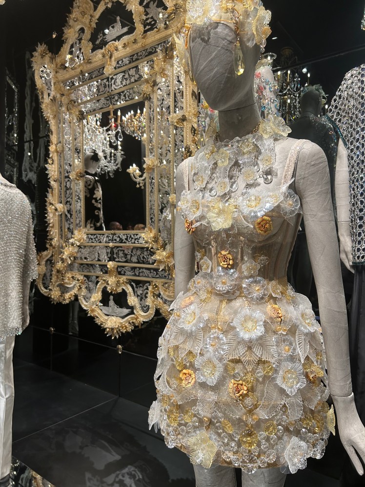 Nous terminons ce parcours dans ma salle préférée qu’on pourrait appeler celle des glaces. Sommes-nous tombés dans le trou du lapin ou passés de l’autre côté du miroir comme dans Alice au Pays des Merveilles ? Car c’est tout à fait l’ambiance qu’évoque cette pièce avec ses miroirs et lustres par « millier ». De plus, on peut y entendre des bruits de brisures de verre, dramatisant davantage la mise en scène. L’ornementation est à son comble et nous éblouit la vue. Ici, les tenues semblent être faites avec des éclats de verre, couvertes de brillants, cristaux et autres imitations de pierres précieuses.