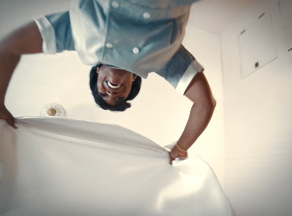 Entre ces deux points — le sol et le miroir — se joue toute l’histoire d’une dépossession, d’un devenir-sujet à un devenir-objet. La caméra, en refusant les plans « neutres », visualise la tension permanente entre voir et être vu, entre exister et être réduit à un reflet. Ce miroir au plafond suggère que l’image de soi, dans un monde raciste et disciplinaire, est toujours déformée, surveillée, en surplomb.