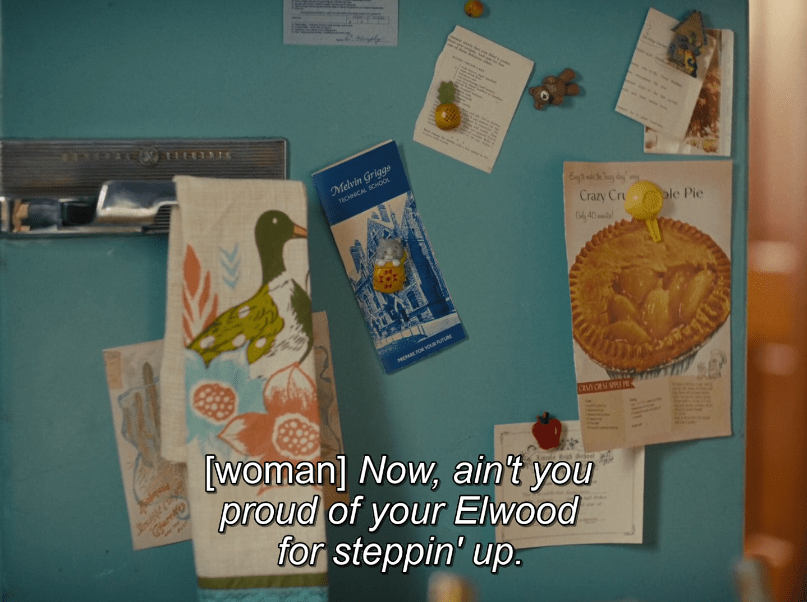 Le prospectus universitaire (le rêve d’Elwood) se décroche du frigo, lentement, en glissant vers le bas, rien n’est dit mais tout est écrit. Ce glissement symbolise à la fois la chute imminente d’Elwood dans le système carcéral et le rêve qui ne tient plus, la promesse d’avenir qui ne tient qu’à un fil (à un aimant).