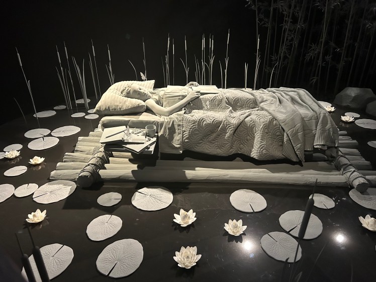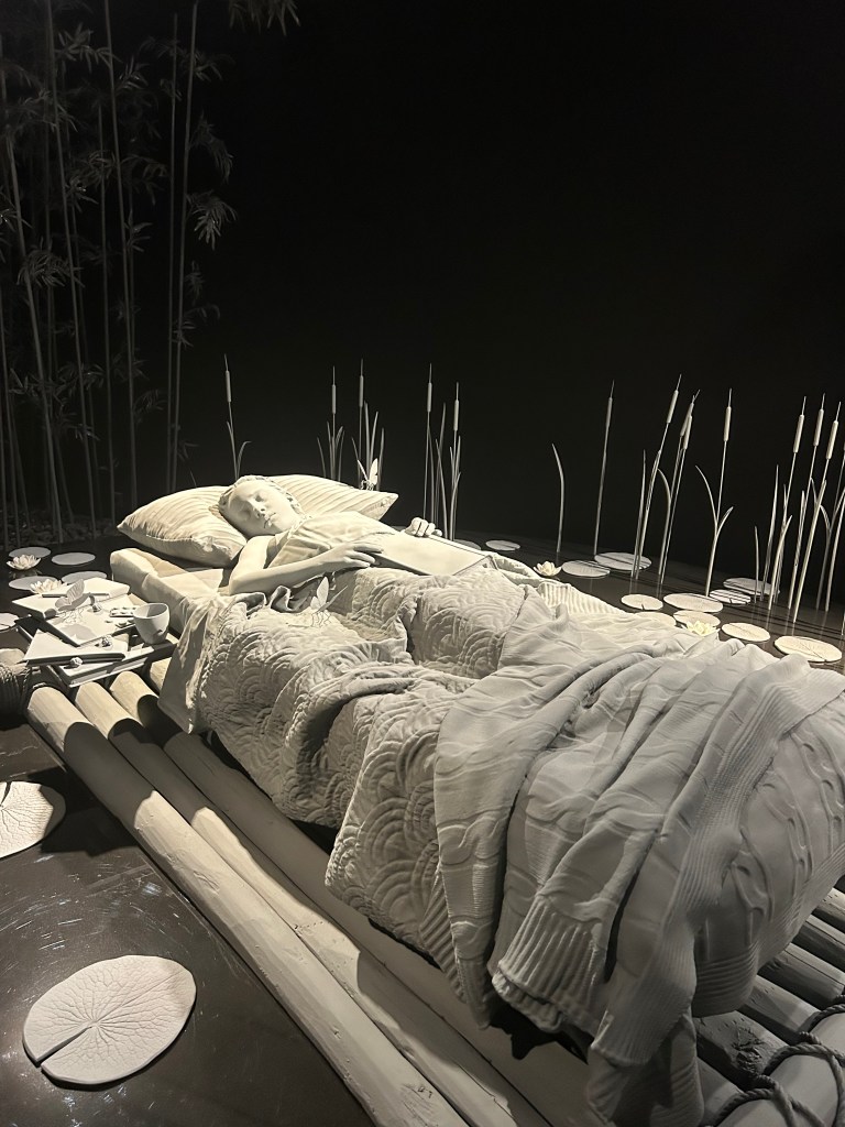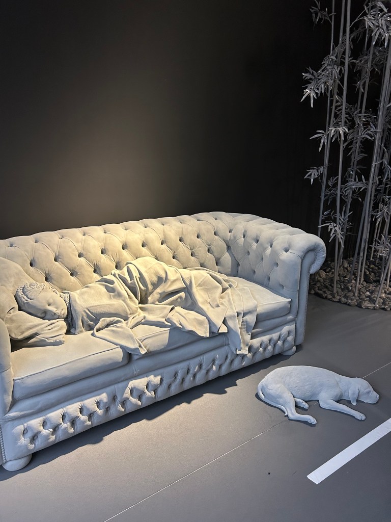 Deux œuvres présentes dans l’exposition montrent une petite fille allongée sur un canapé et sur un lit, en plein sommeil. Ces œuvres capturent un moment d’abandon, de repos, mais sous leur apparence sereine la ligne entre la vie et la mort est mince. La couleur grise confère un aspect presque cadavérique où l’on peut se demander si la fillette est juste en train de dormir ou si elle est morte ? Ainsi, ces sculptures questionnent également la vulnérabilité de notre condition humaine.