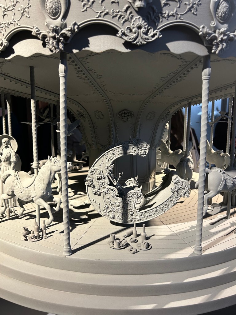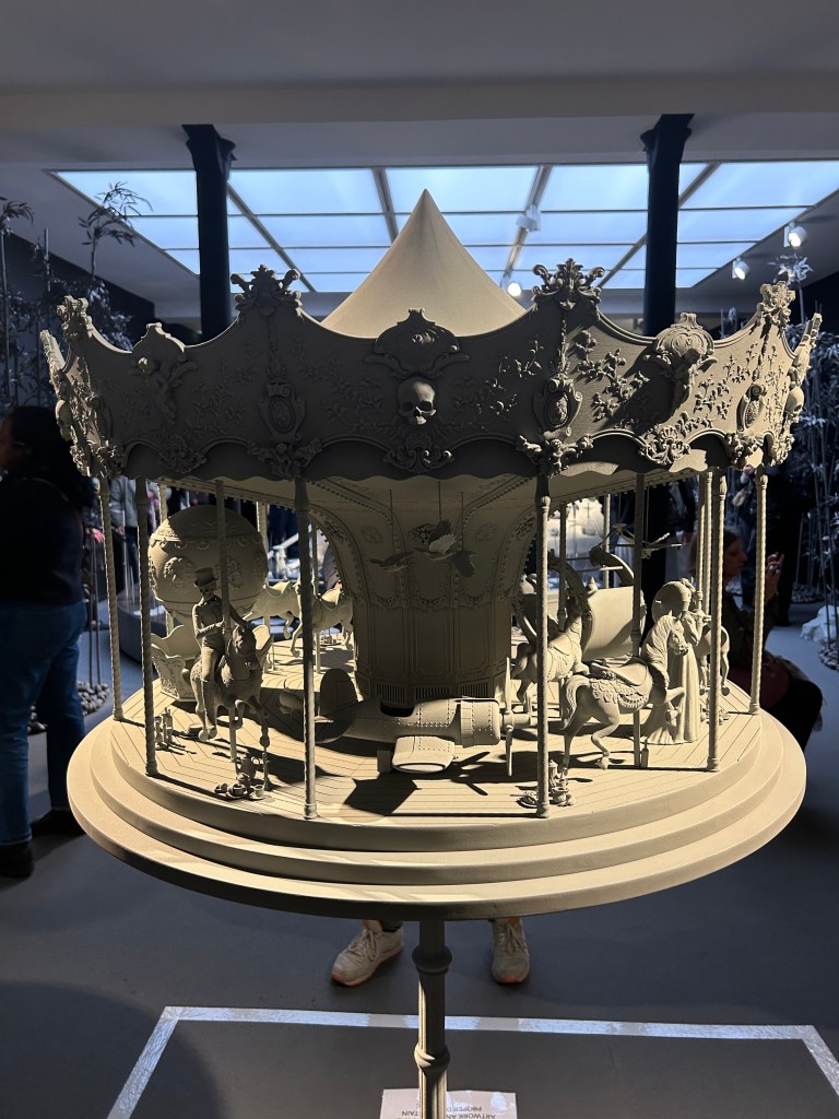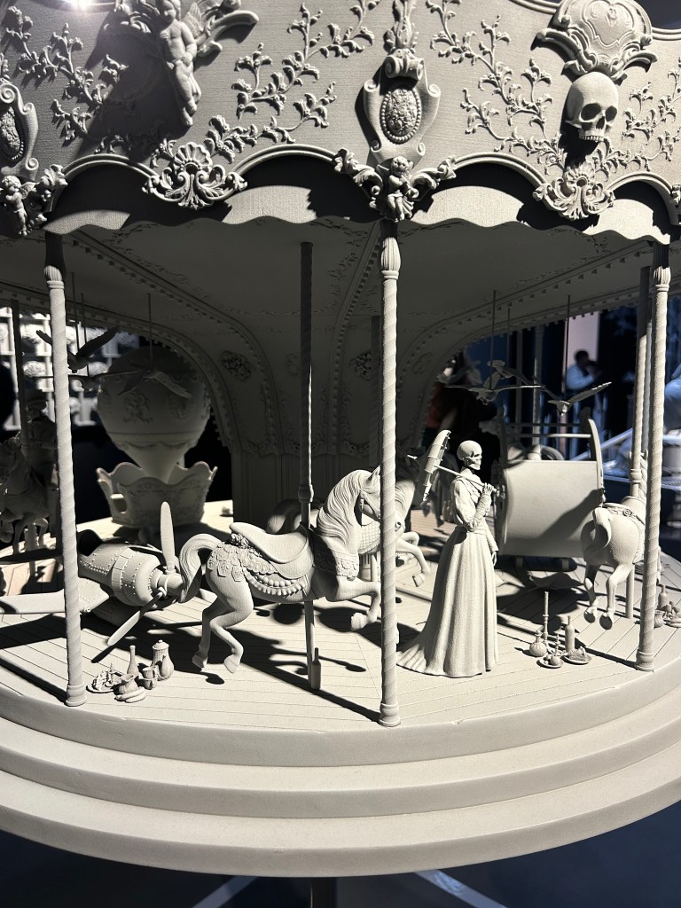 Une reproduction miniature de l’œuvre Danse Macabre trône au milieu de la salle. Il s’agit d’un carrousel avec pour occupant des squelettes. Le carrousel, traditionnellement objet de mouvement, de joie, de cycle, est ici immobilisé. Le gris neutralise la « fête », l’éclat, la vivacité : il reste une sorte d’écho d’un moment qui fut ou qui aurait pu être. Cela rend tangible la « pause », l’attente.