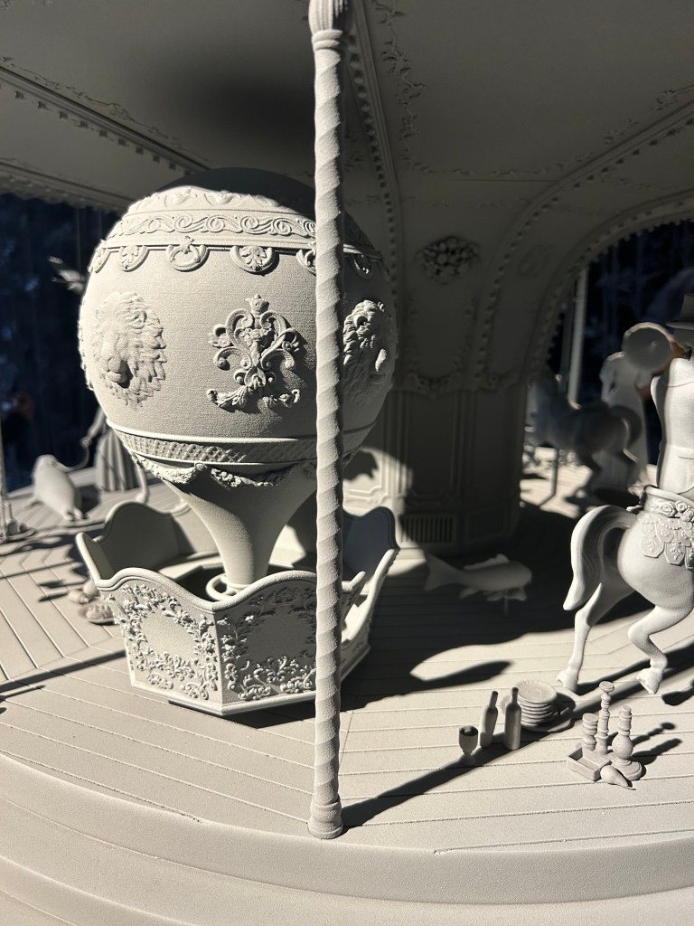 En effet, la caractéristique principale de son travail est qu’il développe une couche grise mat recouvrant ses sculptures, installations, environnements. D’après l’artiste, il s’agit d’un gris qui fossilise les formes, comme emprisonnée dans le temps. Ainsi, ses pièces apparaissent comme faites de pierre, de plâtre pigmenté, ou comme figées dans une sorte d’instant suspendu. Je me surprends moi-même car, de manière générale, je suis beaucoup plus portée par la peinture que la sculpture et de plus, j’aime quand il y a de la couleur! Mais les sculptures de Op de Beeck ont quelque chose de fascinant. Est-ce la couleur parfaitement unifiée sans aucune trace de pinceau ? Est-ce l’effet mat qui donne envie de caresser la matière ? Est-ce les détails saisissants ? Ou l’ambiance que provoquent ces œuvres ? Sûrement un peu de tout cela.