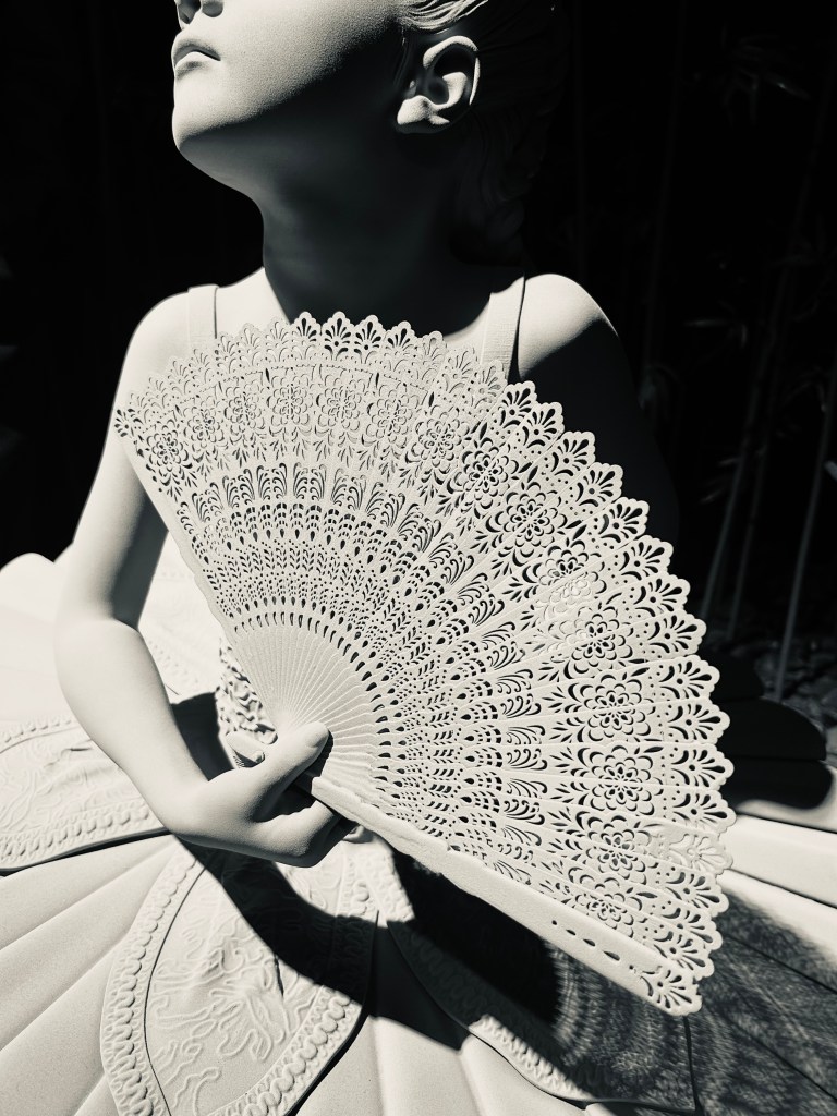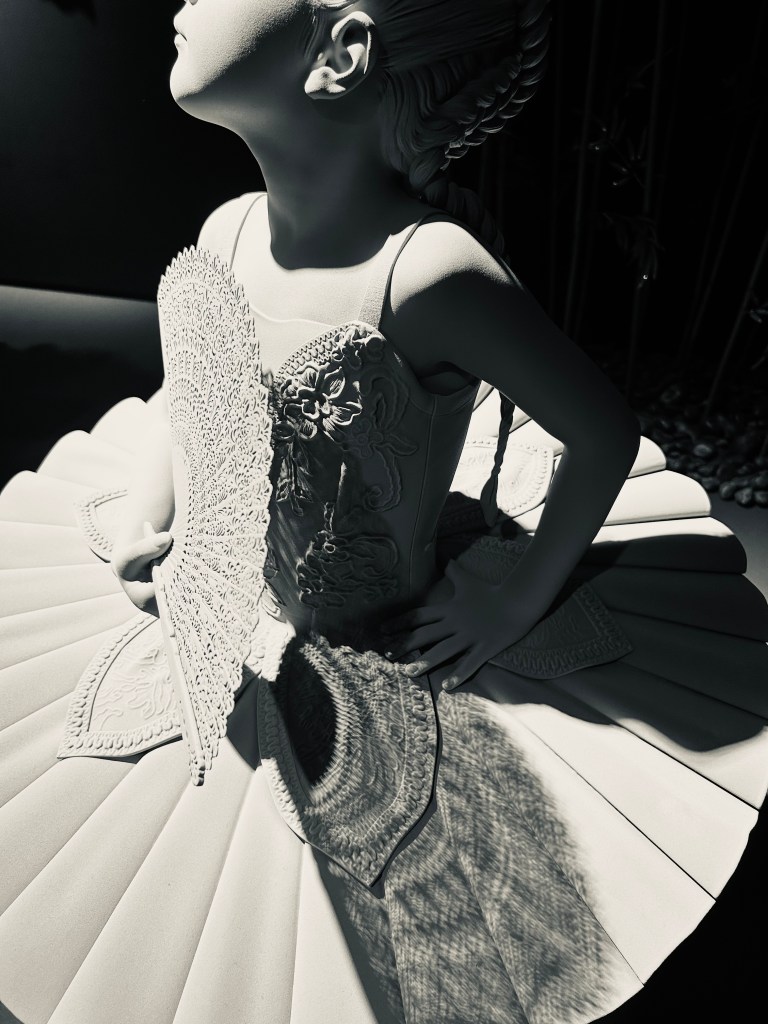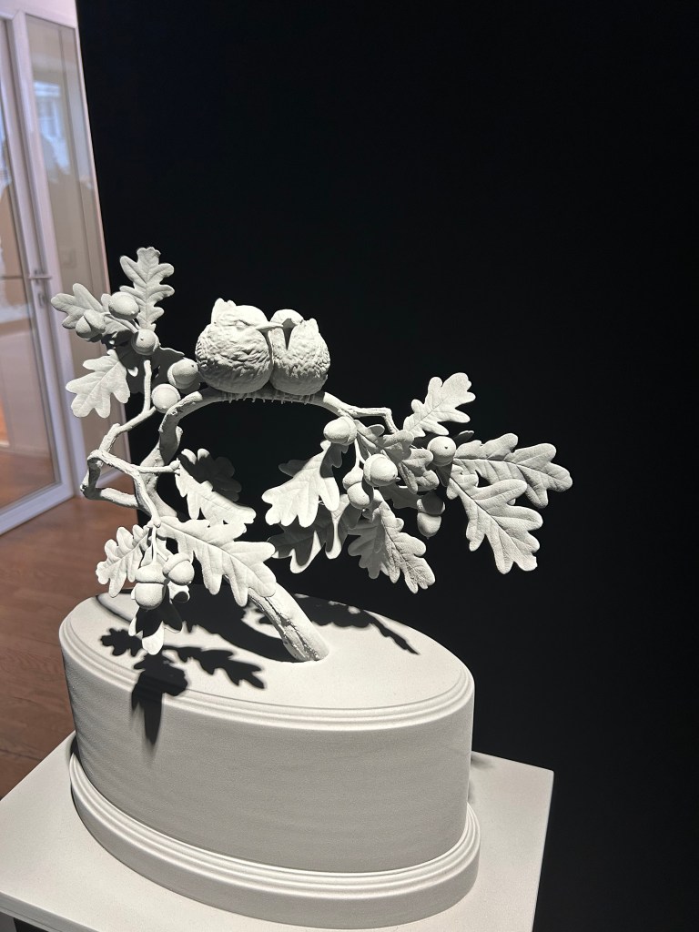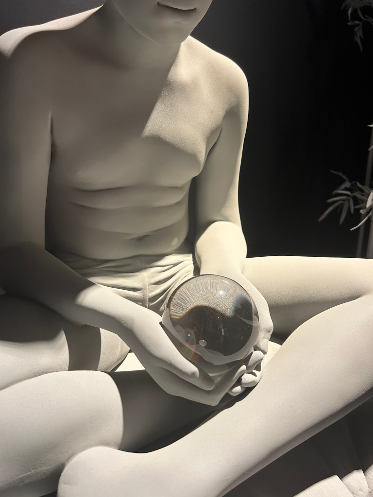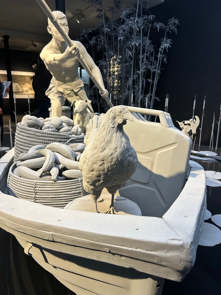 En éliminant la couleur, l’artiste crée un espace visuel neutre, suspendu, où l’on se détache du monde « vécu » pour glisser vers le monde « représenté ». La sculpture ne me dit pas « voici ceci », mais suscite une humeur, une émotion. Le gris fait penser à une archive, à un souvenir, à une empreinte. Le monde que l’on traverse chez l’artiste n’est pas celui de l’actualité trépidante mais plutôt celui d’un « après » : des traces, des vestiges, ou un moment juste après l’événement. Le revêtement monochrome, plutôt que d’être simplement un choix esthétique, fonctionne comme un révélateur : les plis d’une robe, le souffle d’un personnage, la silhouette d’un animal apparaissent grâce à la réflexion de la lumière sur cette surface unie. Cela crée une sorte de « peau » qui enveloppe la sculpture et en adoucie les contours.