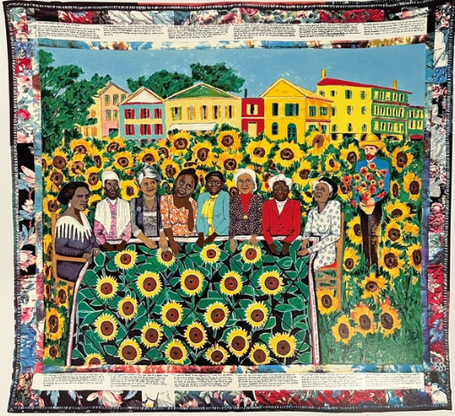 L’œuvre représente huit femmes noires historiques majeures réunies autour d’un quilt, dans un champ de tournesols, à Arles (ville du sud de la France célèbre pour avoir inspiré Vincent van Gogh). Les femmes cousent ensemble, puissantes et solidaires. À l’arrière-plan, Van Gogh lui-même observe la scène, tenant un vase de fleurs, comme un témoin ou un spectateur. Il est ici une figure secondaire, presque timide. Ringgold renverse la dynamique : ce n’est plus le peintre blanc européen qui capte l’image du monde, mais des femmes noires qui créent leur propre scène d’histoire.